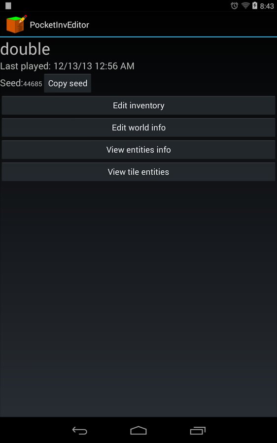 Программа может редактировать инвентарь, изменять местность, спаунить мобов и т.д. без подключения к PC и ROOT-прав. Программа проста в использовании и полностью русифицирована.