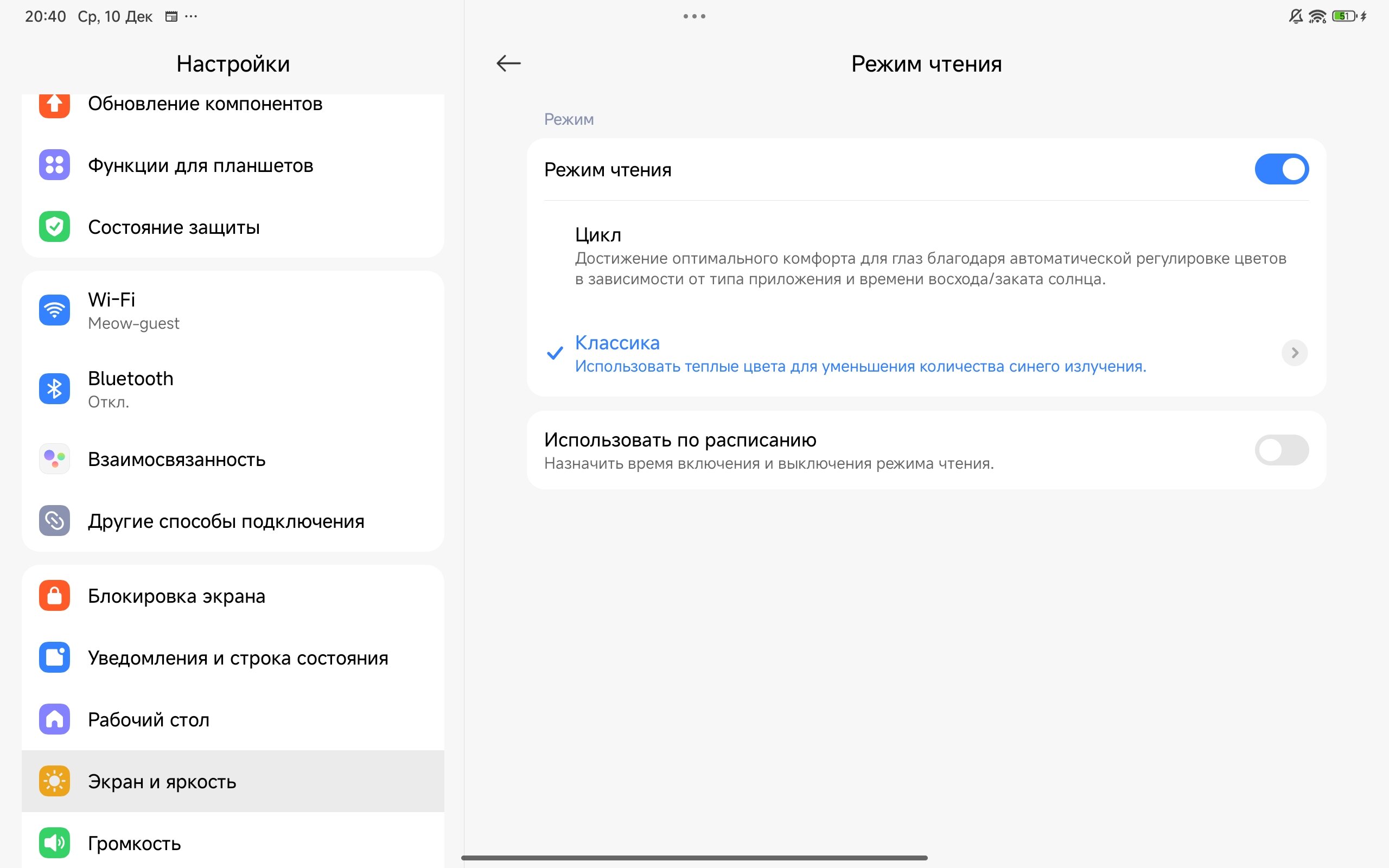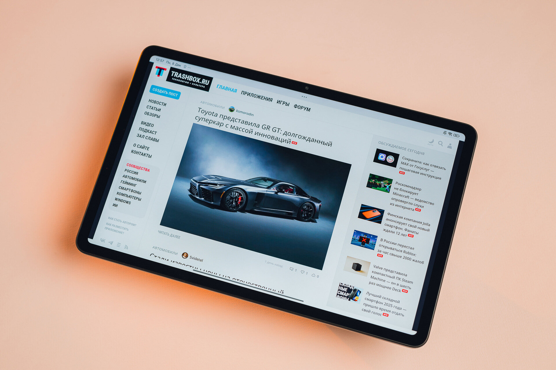 Экран поддерживает отображение 1,07 млрд цветов и получил сертификат Dolby Vision. На практике дисплей хороший, особенно по меркам своего класса — цвета насыщенные, яркость более чем достаточная (я в основном использовал в квартире), есть различные сертификаты TÜV Rheinland о защите зрения (от синего света, мерцания, вредного воздействия на циркадные ритмы). Любопытной особенностью экрана мне показалось распознавание сенсором мокрых пальцев. Не могу сказать, что эта технология работает идеально, но во время неоднократного тестирования при готовках на кухне планшет распознавал мои мокрые пальцы и не самовольничал при попадании капель на экран.