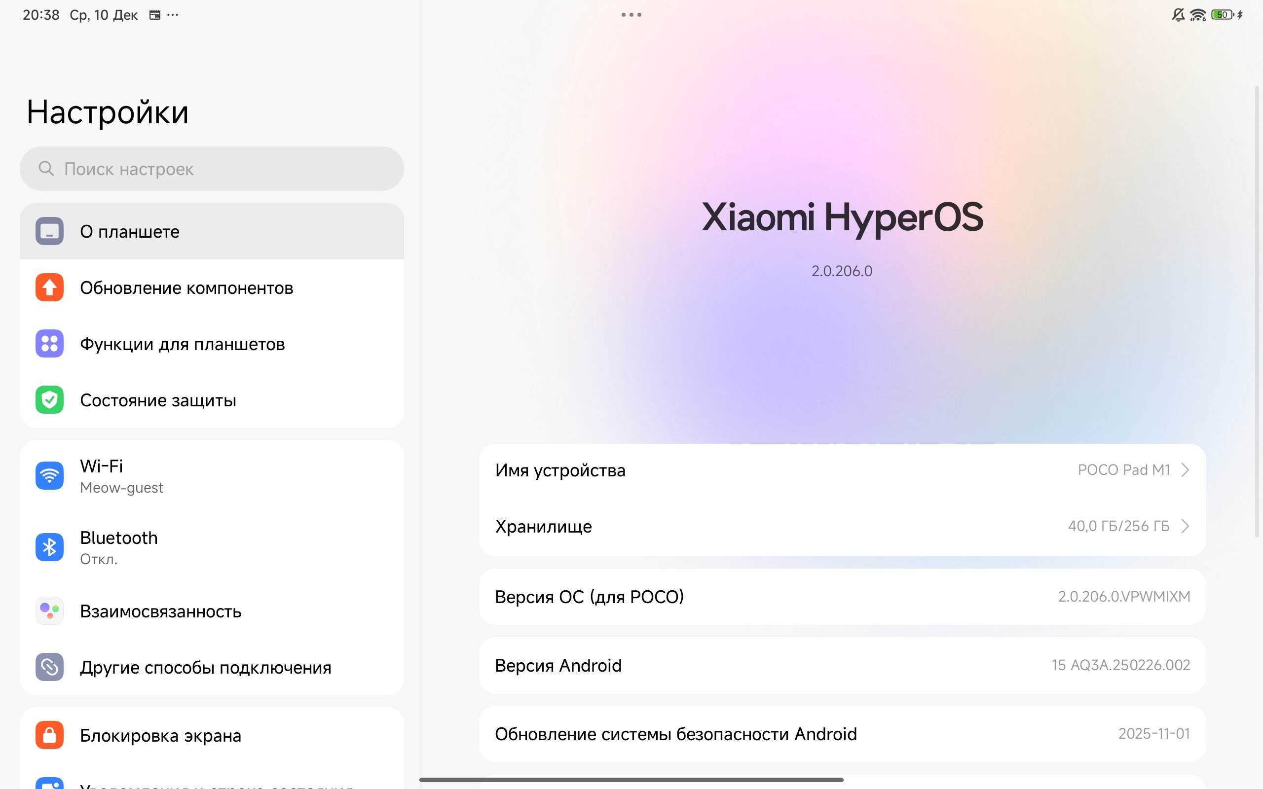 POCO Pad M1 поставляется с платформой HyperOS 2, базирующейся на Android 15. Система идентична «смартфонной» версии, так что если вы пользовались телефонами POCO, Xiaomi или REDMI, то прошивка вам уже знакома.
