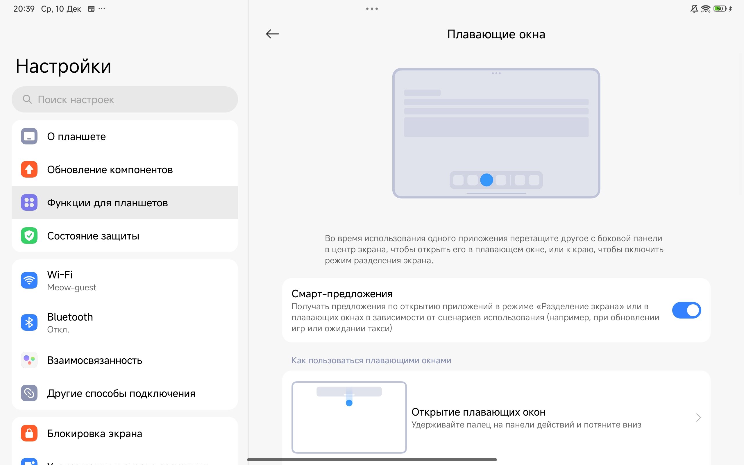 Давайте остановимся именно на планшетных функциях: здесь есть режимы разделения экрана (нужно потянуть второе приложение из боковой панели к краю дисплея) и запуск плавающих окон (из боковой панели в центр), а также быстрое открытие ранее запущенных плавающих окон (долгий тап и свайп вниз по панели действий).