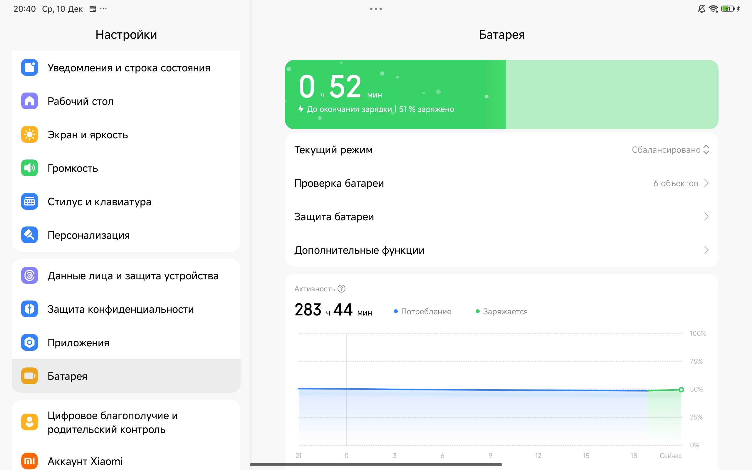 В Pad M1 с экраном на 12,1 дюйма поместился аккумулятор на 12 000 мА⋅ч — это самая большая батарея в ассортименте устройств POCO на данный момент. По официальным заявлениям, её хватает на 14,24 часа воспроизведения видео по интернету. В реальном использовании цифры приблизительно такие же, на комфортной для меня яркости экрана (где-то 65–80% в зависимости от времени дня) планшет проработал при воспроизведении видео, мессенджерах и казуальных играх где-то 12–13 часов.