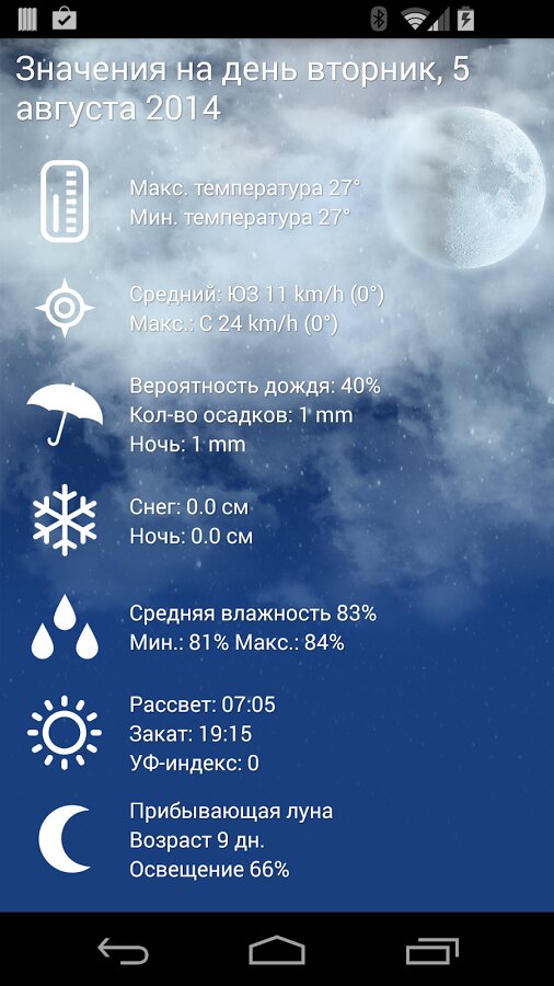 - Подробные прогнозы по дождю, льду, снегу, туману, ветру, буре, уровню росы, индексу УФ, влажности, давлению