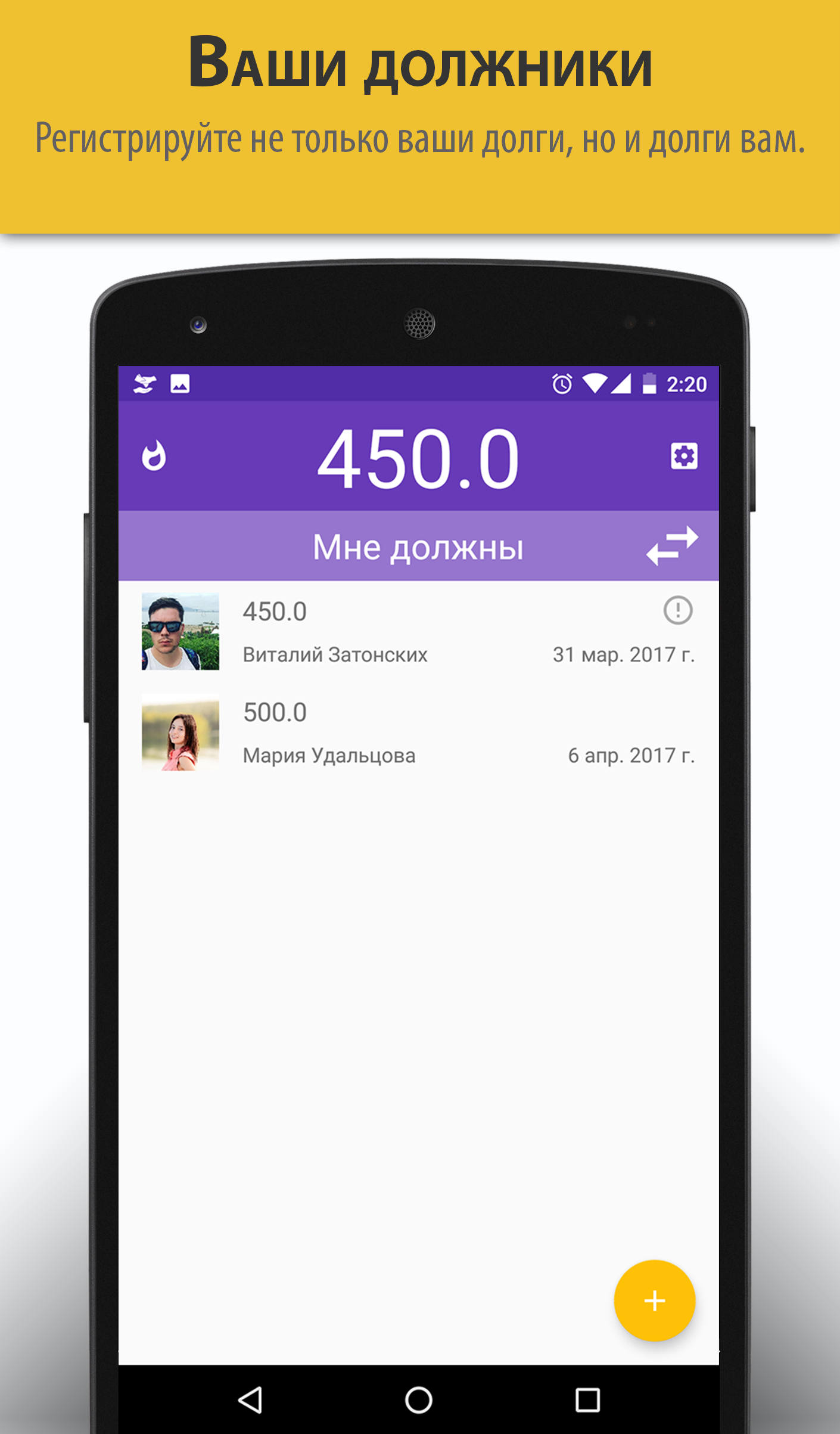 - Позволяет очень быстро оперировать долгами. Добавлять долги действительно очень просто.