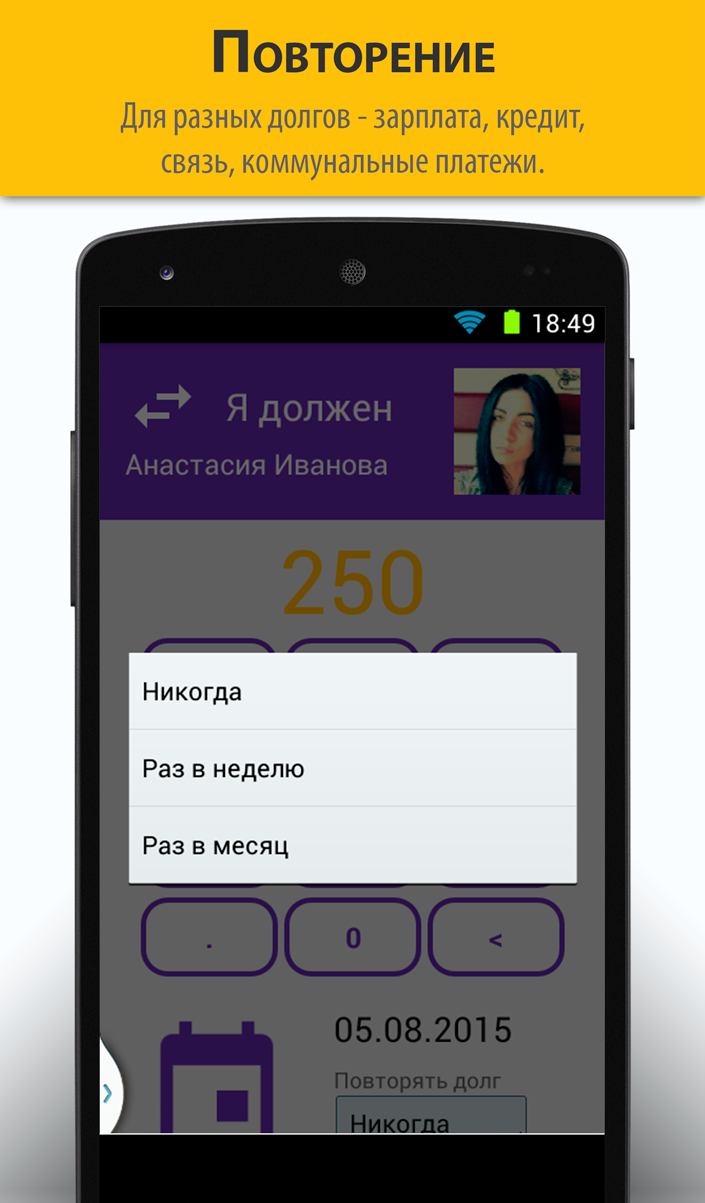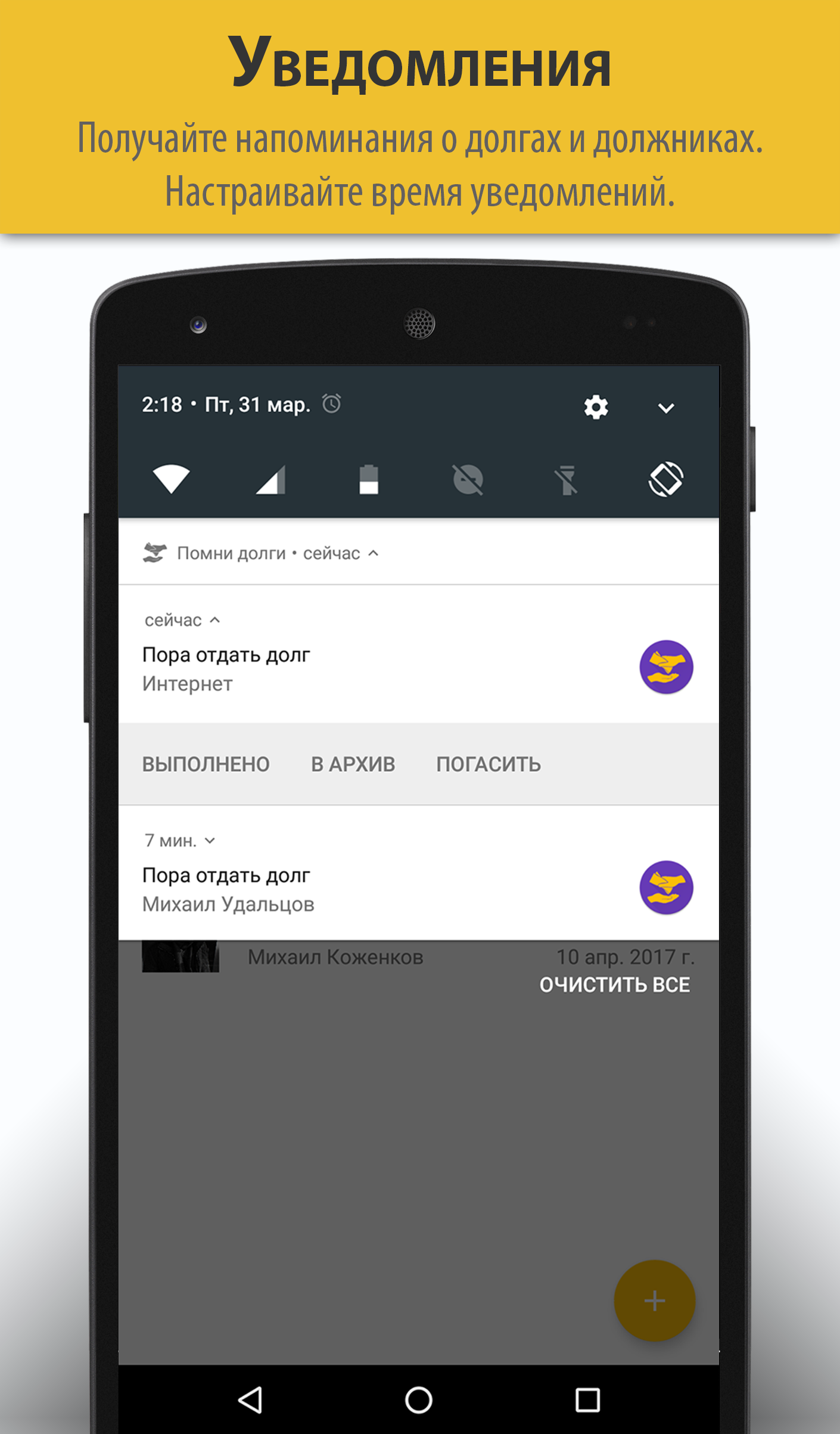 - Позволяет выбирать, когда напоминать о долгах, каждый день или раз в месяц.