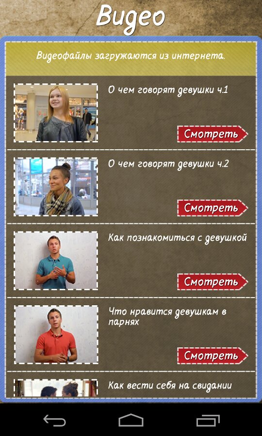 Автор поможет разобраться во многих сложных ситуациях и ответит на все ваши вопросы. В уроках собрано все то, что вы ищите в интернете и книгах. Скачав приложение, вы узнаете о том, как вести себя в компании девушки, как развить свою сексуальность, сделать свидание незабываемым, а также улучшить свои навыки в искусстве поцелуев, секса и даже массажa! Это не пикап, цель которого — применить все позы камасутры на первой встречной. Это то, что поможет завести новые знакомства, приобрести интересных друзей и, конечно же, настоящую любовь!