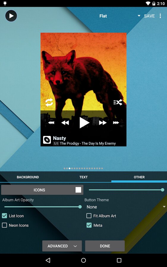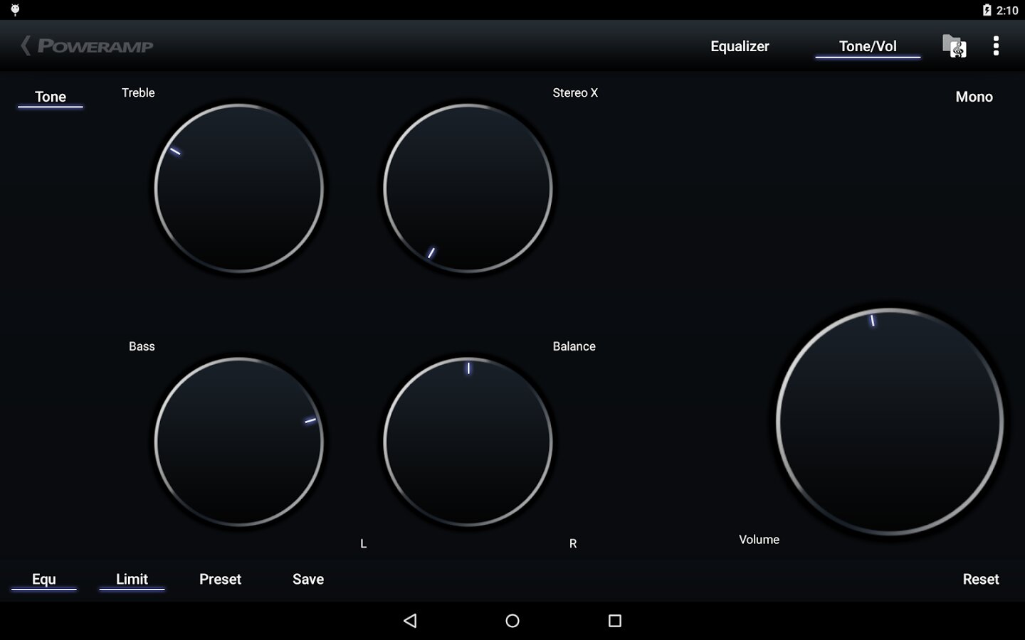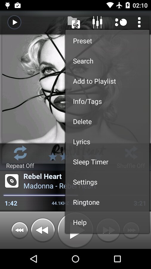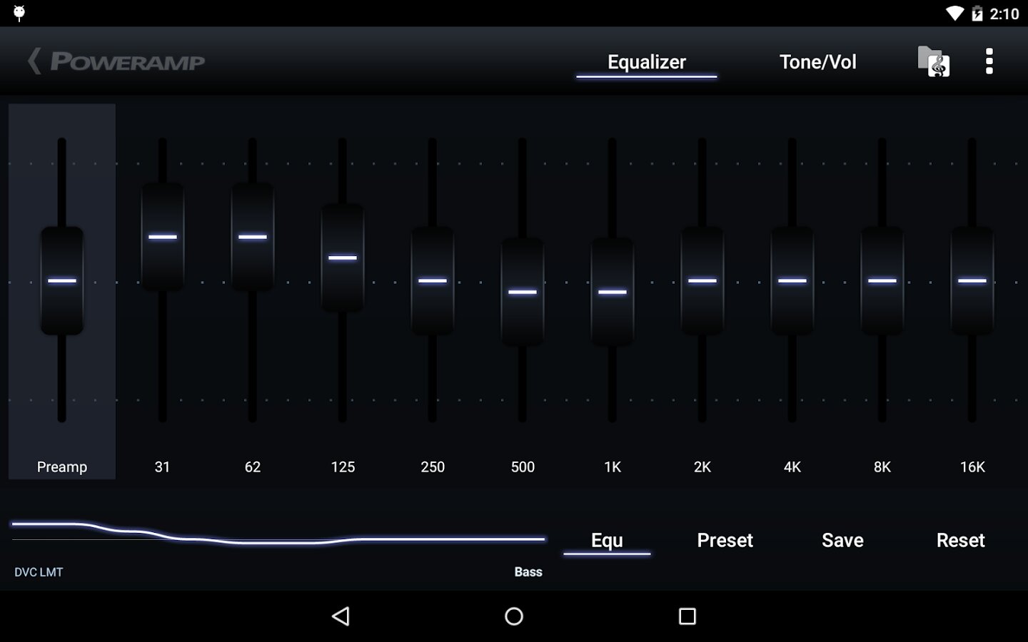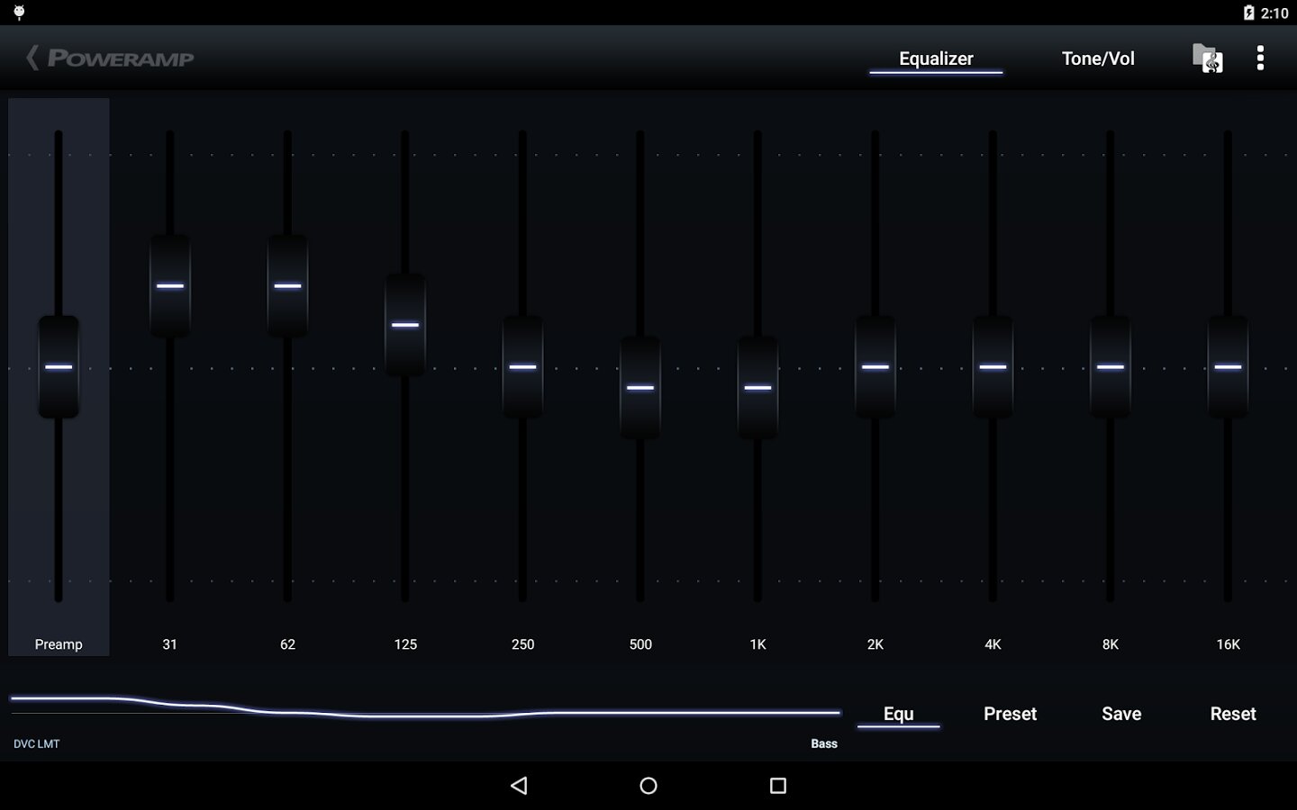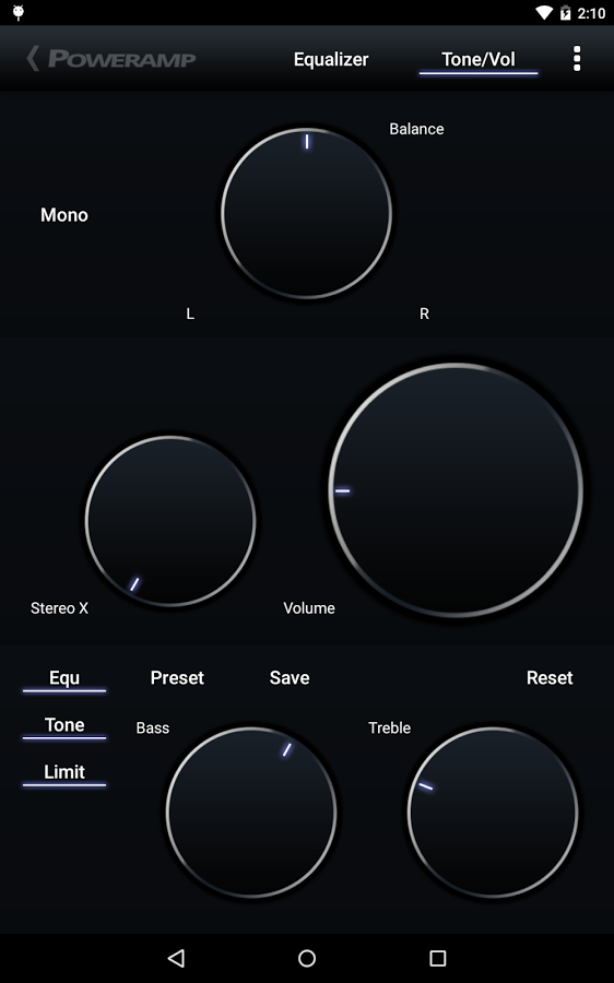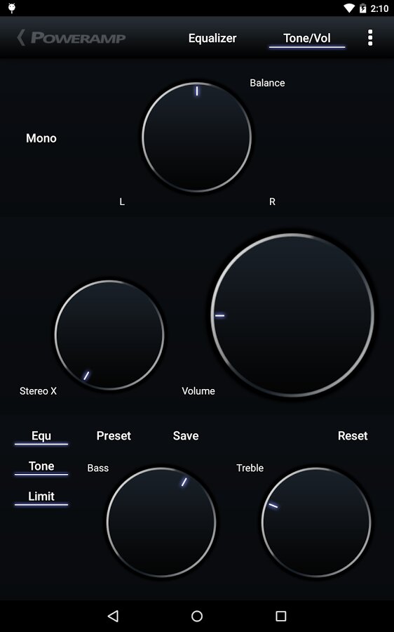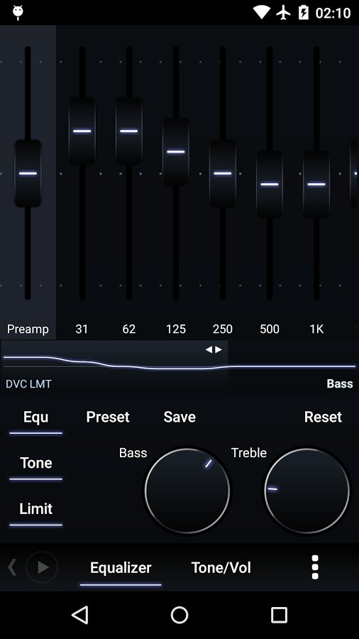 - оптимизированный 10-ти полосный графический эквалайзер для всех поддерживаемых форматов, отдельное управление тоном, предустановки (пресеты) эквалайзера, возможность редактирования и добавления пресетов, назначение для песен/аудио-выходов.