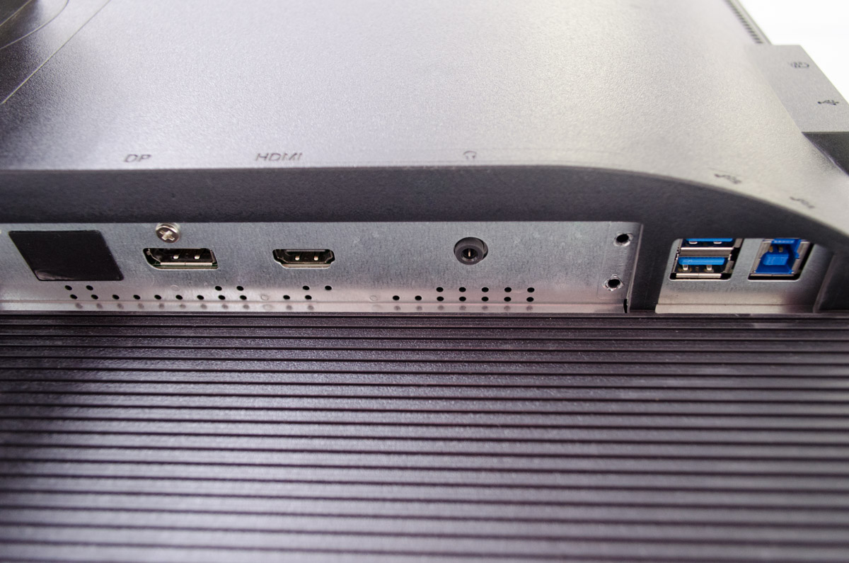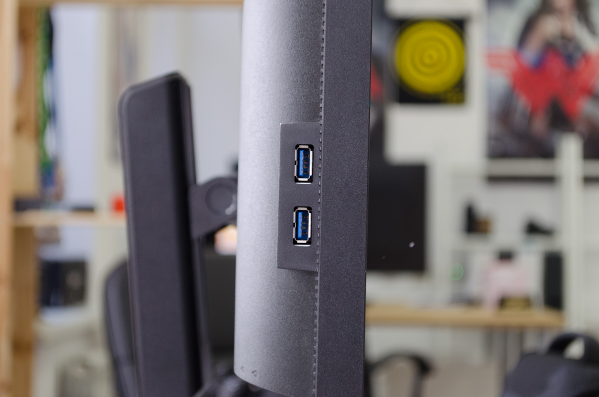 С обратной стороны корпуса находится массивный выступ, в котором скрывается электронная начинка монитора, а также пара встроенных динамиков. Бок о бок с входными разъемами размещается пара USB 3.0 для подключения периферии.