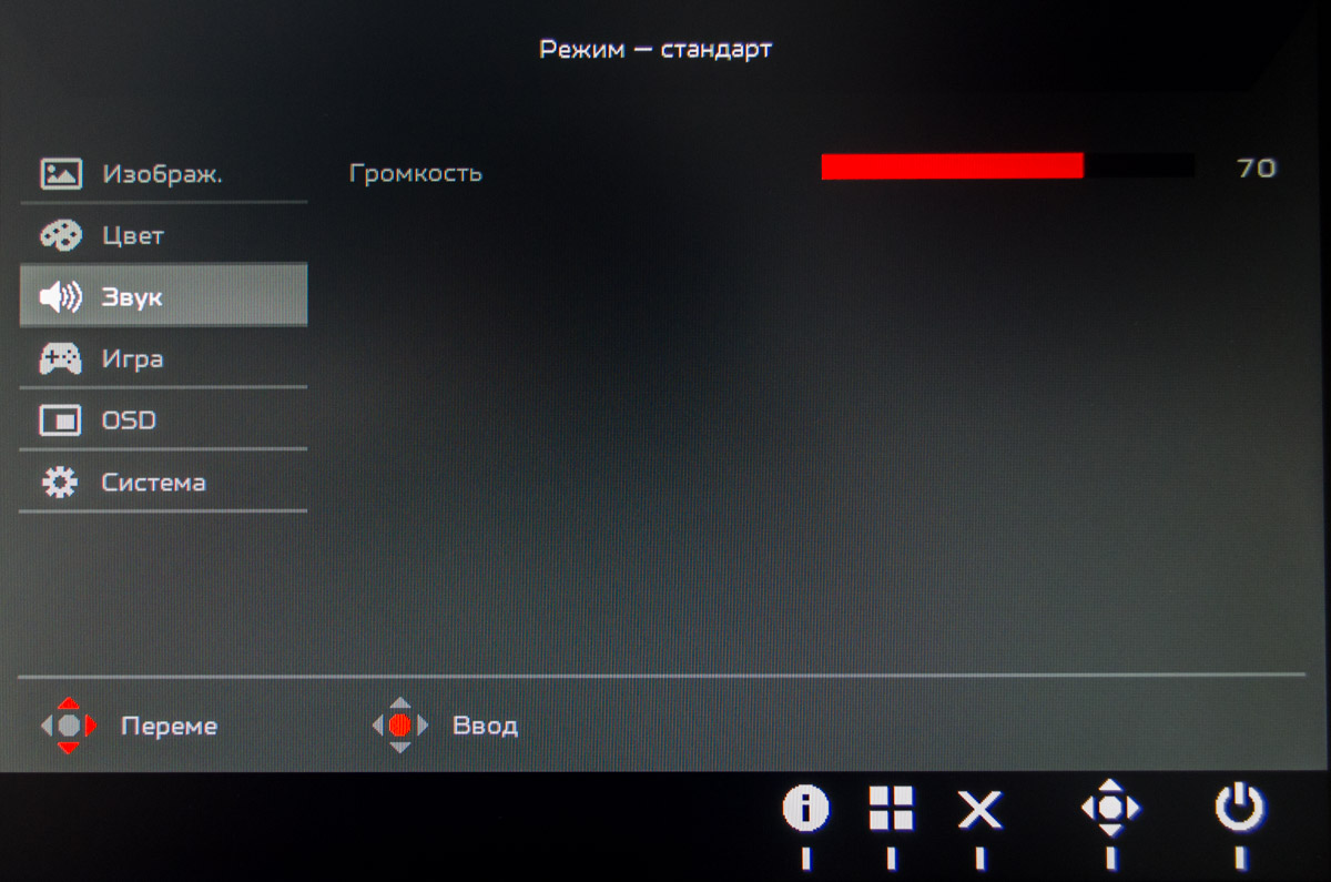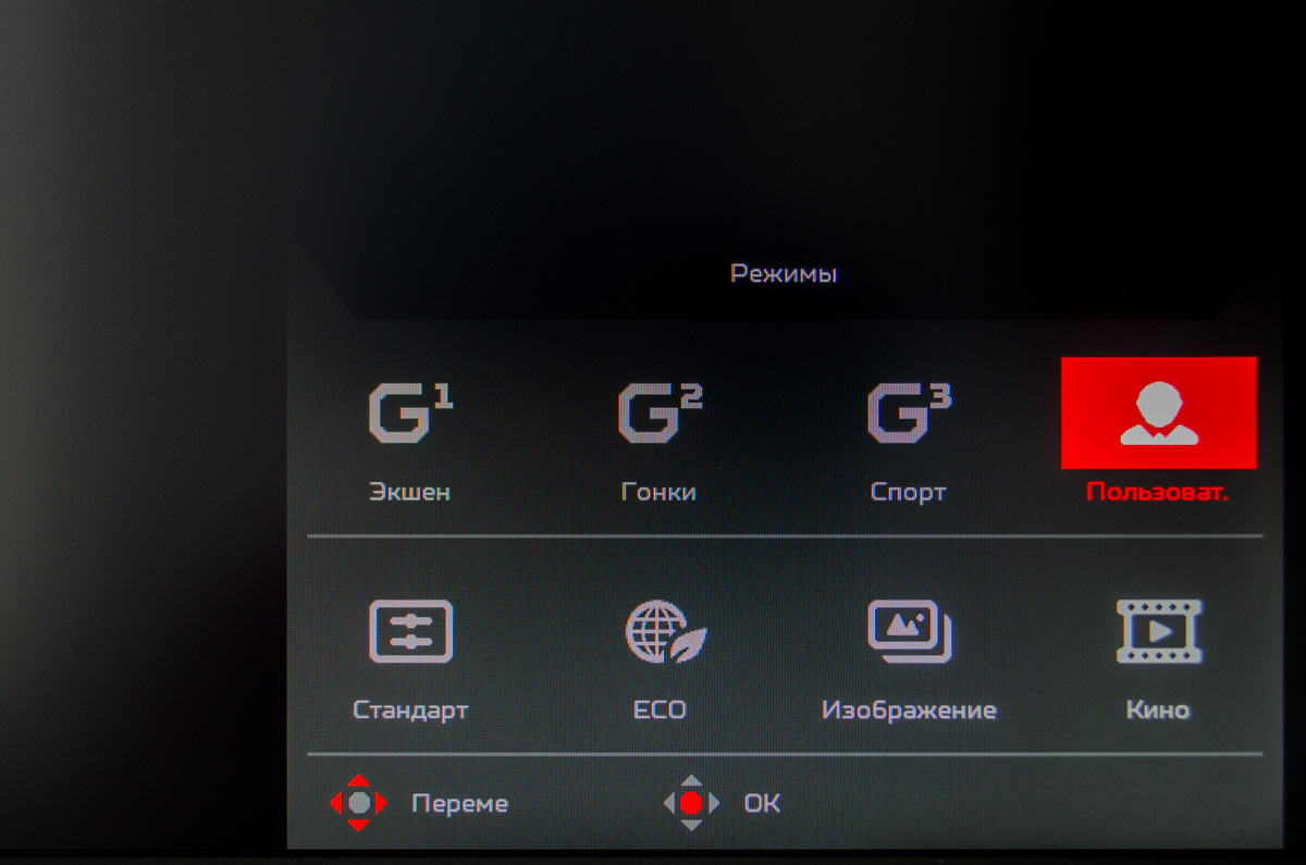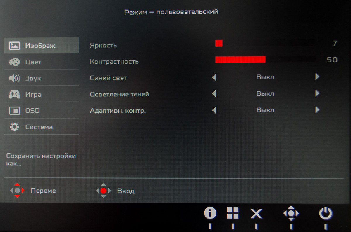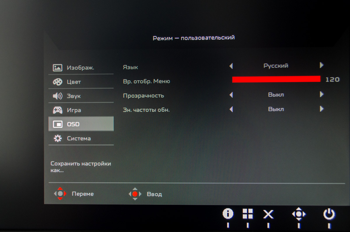 Назначение клавиш выводится на экран, стоит активировать встроенное в монитор меню настроек. Благодаря джойстику, переключаться между различными позициями в этой черно-красной таблицей совсем не сложно.