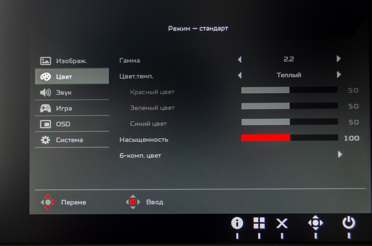 В следующем разделе экранного меню приводятся цветовые настройки. Помимо стандартных параметров, вроде гаммы, насыщенности и цветовой температуры, здесь вручную регулируется цветопередача по трем или шести каналам.