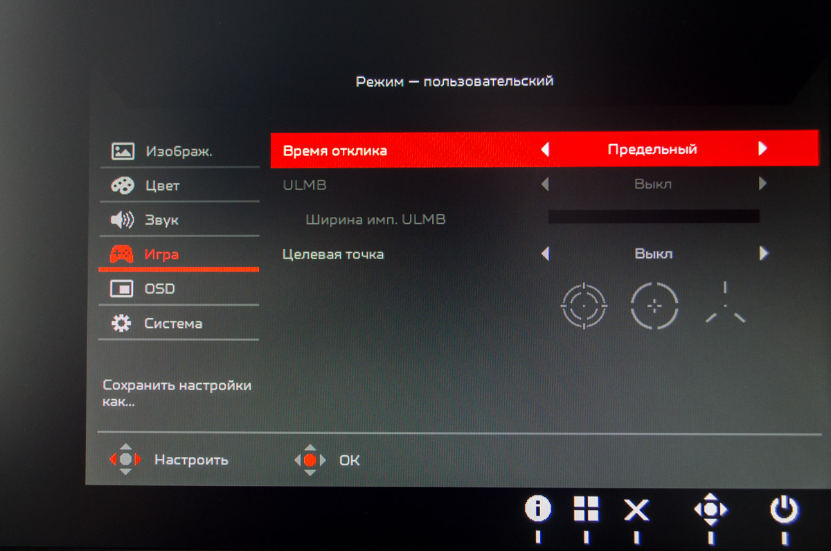 Пункт «Игра» собрал функции, интересные геймерам. Здесь находится управление временем отклика матрицы, активируется интегрированный в монитор режим «Ultra Low Blur Mode» (ULBM), сокращающий размытие быстро движущихся объектов. Тут же включается наэкранный прицел, подобный тому, что мы уже видели у игровых мониторов других производителей. Это полезная функция, но для довольно узкой категории геймеров, поскольку метка по центру экрана полезна только в некоторых шутерах.