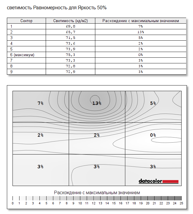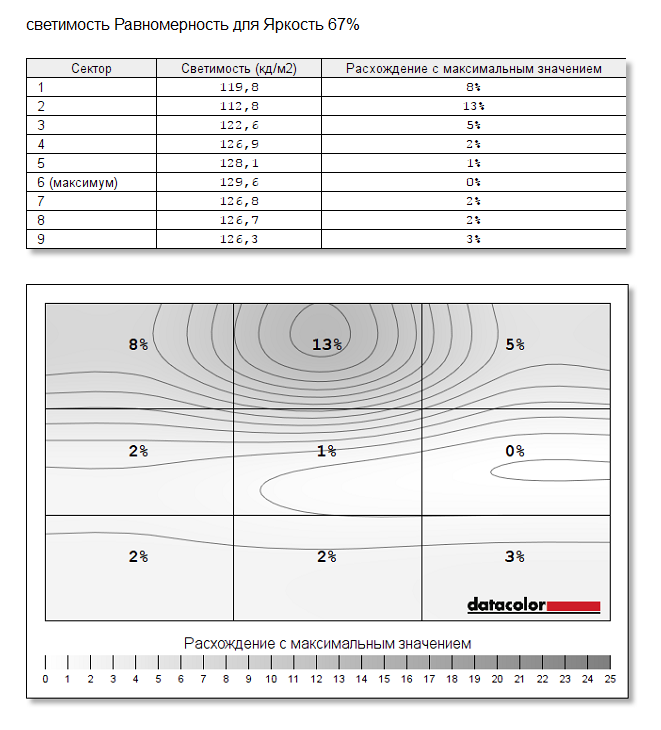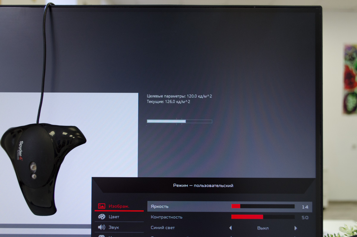 Максимальная яркость экрана высокая. Рекомендуем уровень в 14%. Визуально белое поле равномерно, но на черном фоне можно различить легкую торцевую засветку в нижней части экрана.