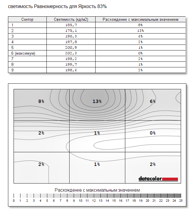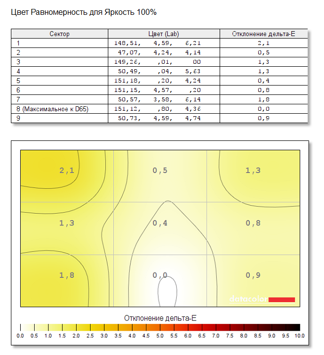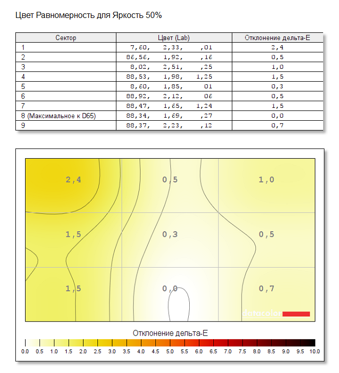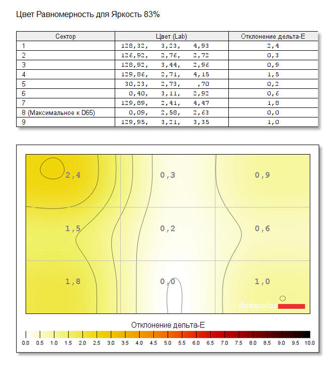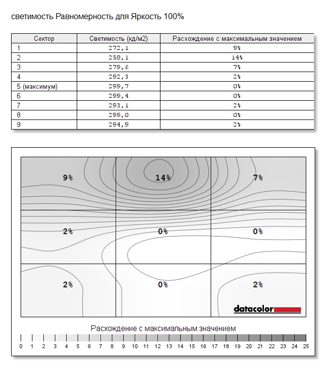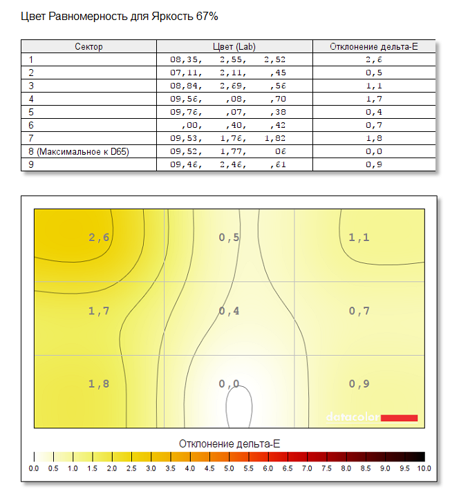 Измерения, выполненные при помощи профессионального оборудования, наглядно демонстрируют неравномерное отображение цветов, а также заметно более яркую зону в верхней части дисплея. Таким образом, низкая однородность экрана становится одним из основных минусов Predator XB272.