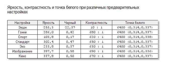 Мы изучили набор предустановок, загруженных в память монитора на заводе. В большинстве случаев изменения незначительны, но «спорт» и «экшн» выбиваются из общего ряда. Для первого режима характерна необычно низкая яркость, для второго — низкая контрастность.