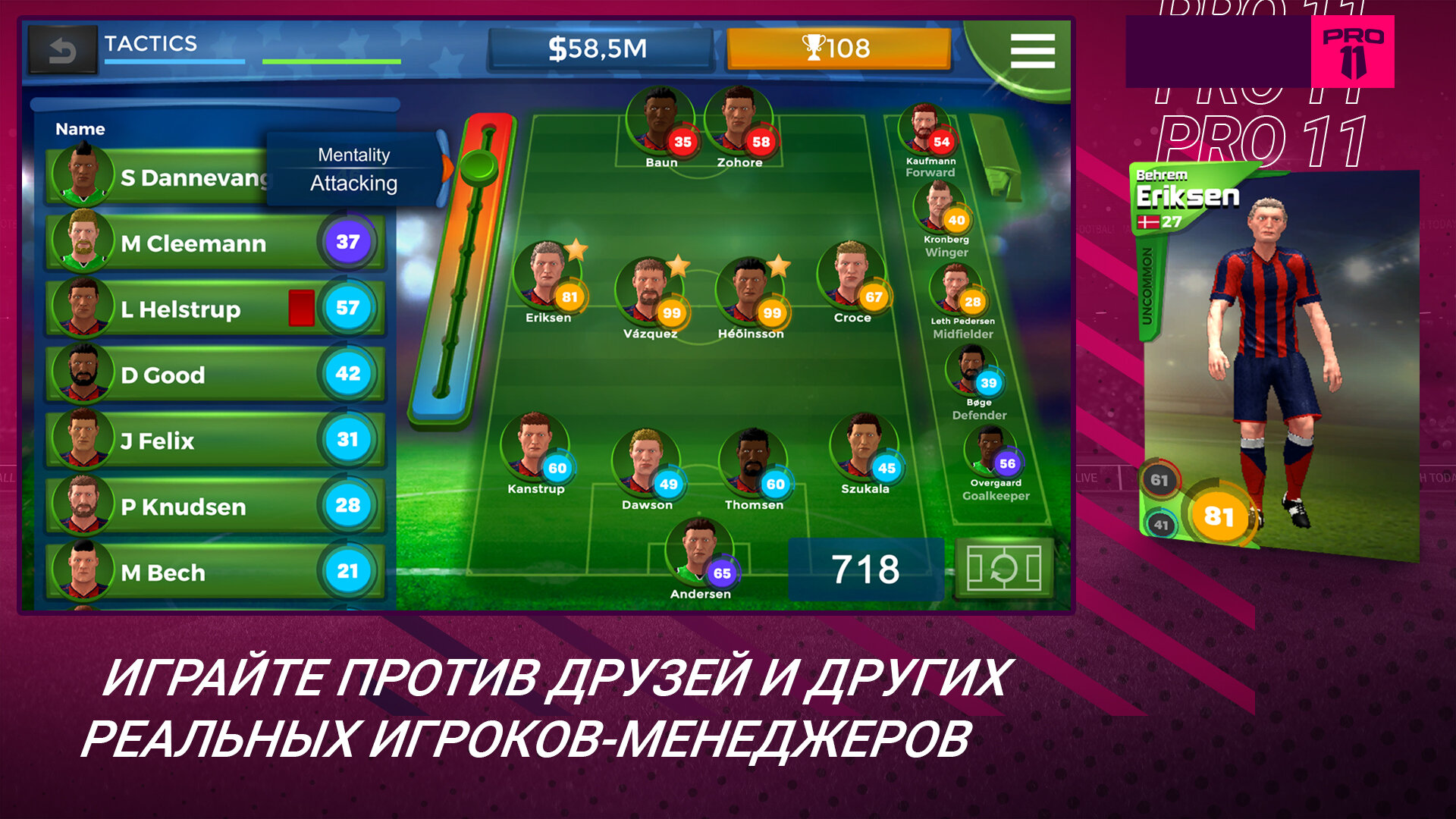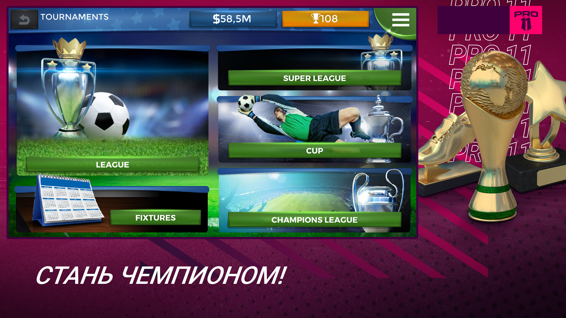 В выпуске Pro 11 вы сможете контролировать свой любимый клуб (например, «Мадрид», «Ювентус» или «Барселону») и привести его к победе в лучших национальных лигах, а также лиге чемпионов!