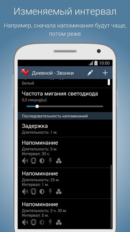 - Настраиваемое расписание напоминаний: произвольный порядок напоминаний, настройка длительности и количества напоминаний.