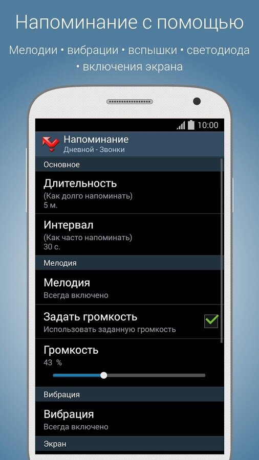 - Напоминание с помощью: мелодии, вибрации, включения экрана, вспышки камеры.
