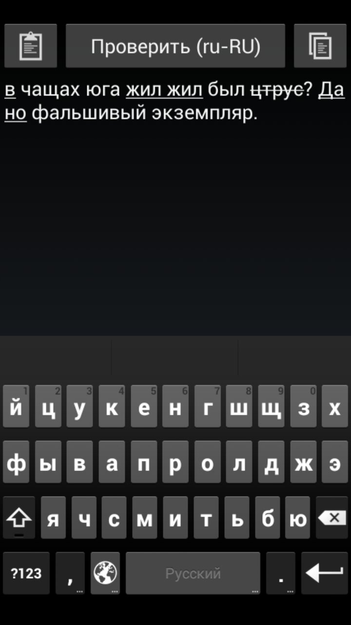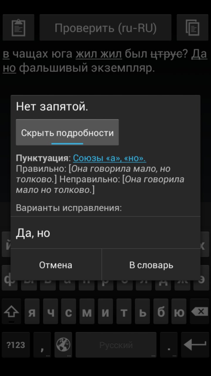 Проверка грамматики — единственная программа на Android для проверки грамматики, стиля и орфографии, которая понимает русский и английский языки и может работать автономно без подключения к Интернет.