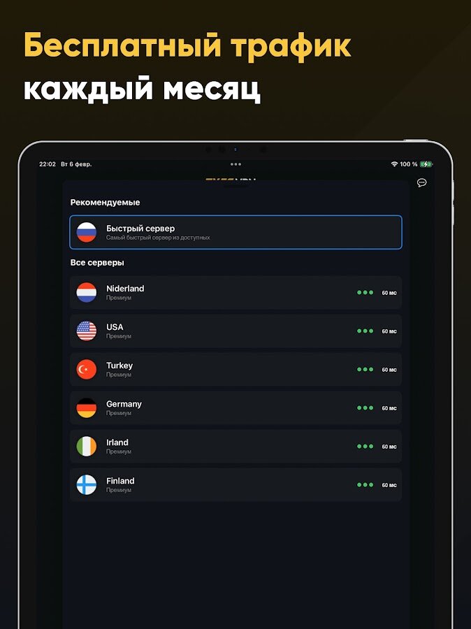 Пуля VPN гарантирует высокую скорость соединения, практически равную вашей домашней сети, и предлагает бесплатный трафик каждый месяц без необходимости регистрации. Конфиденциальность пользователей — приоритет, поэтому данные не собираются и не хранятся. Идеальный выбор для тех, кто ценит простоту, безопасность и свободу в интернете.