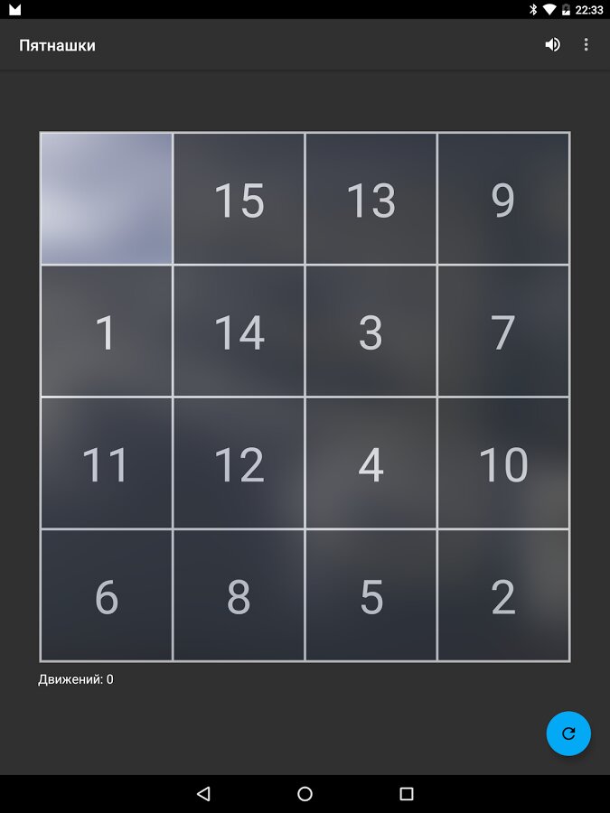 Пятнашки - Классическая головоломка «Пятнашки» с минималистичным интерфейсом. Реализована поддержка анимации движений плиток, поддержка цветовых тем. Также имеется возможность использовать случайную картинку в качестве фона, чтобы сделать игру более забавной.