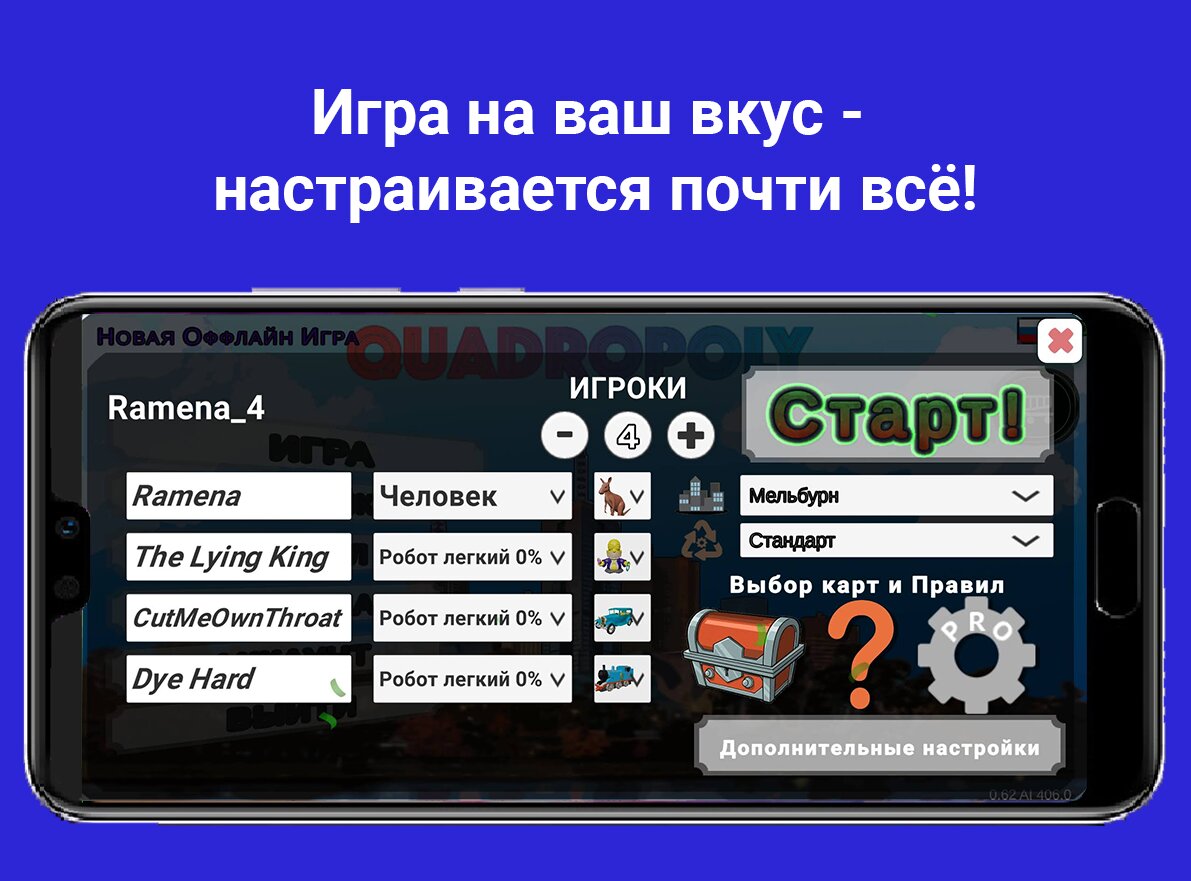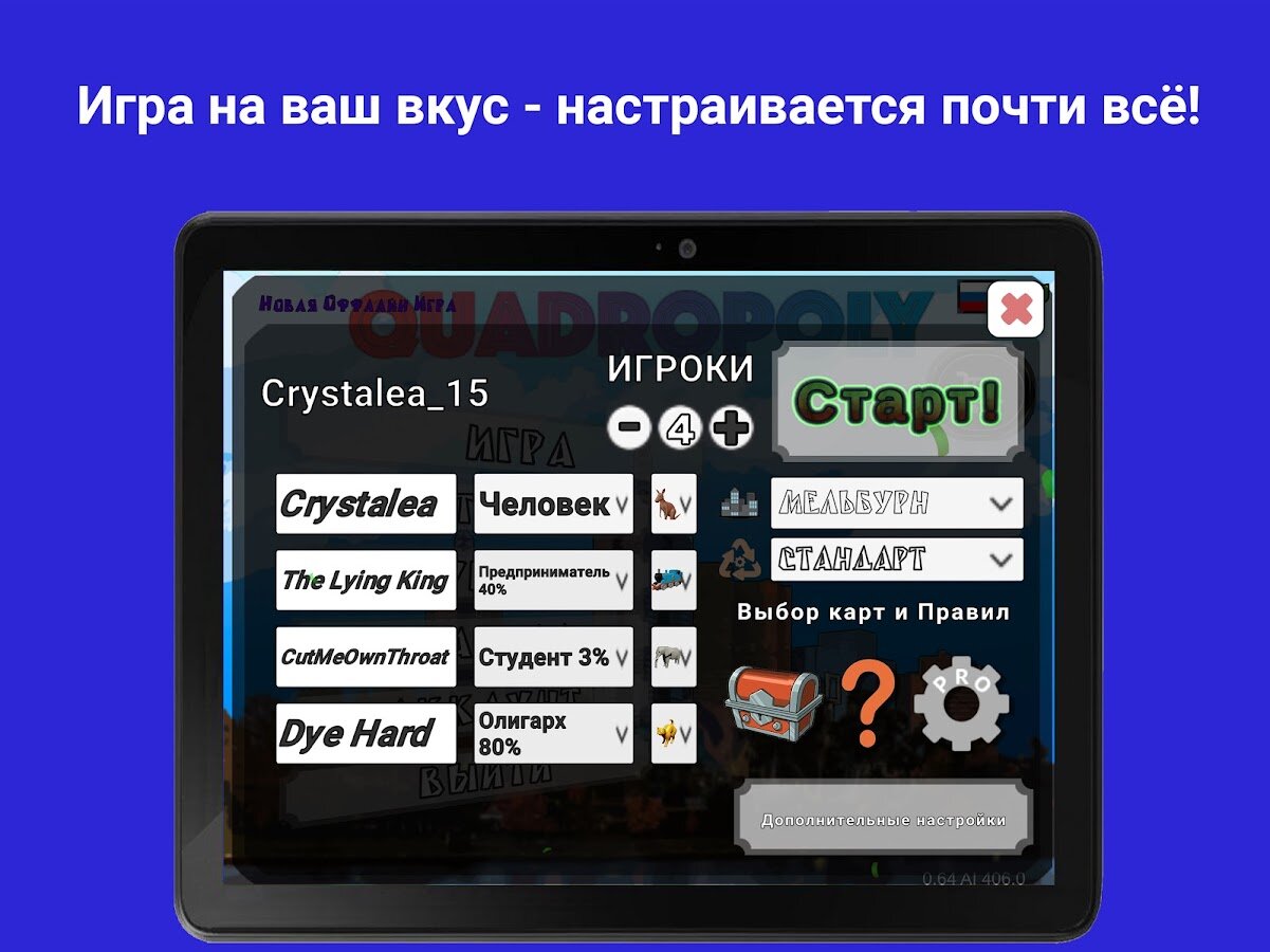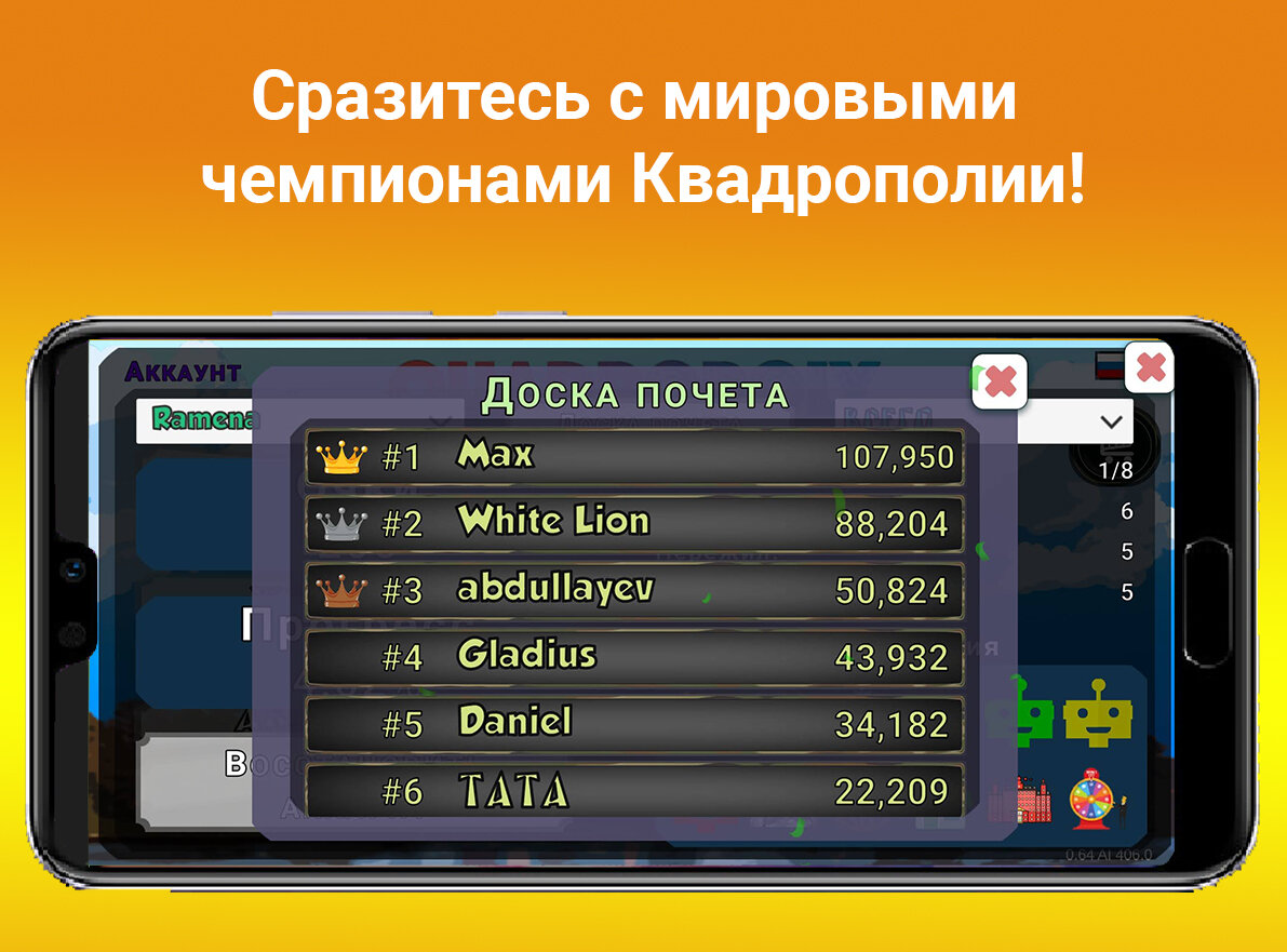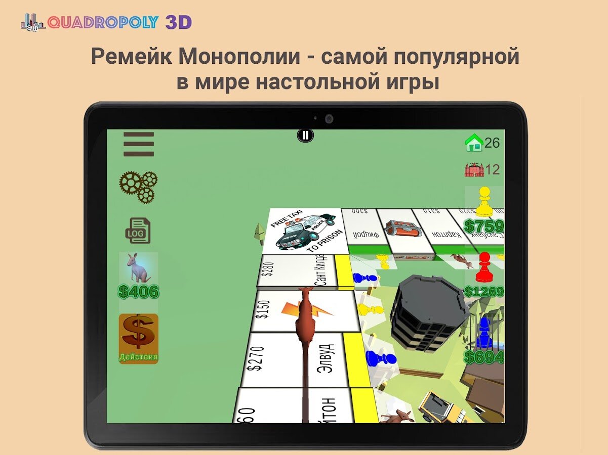 В новой версии Квадрополия была полностью переработана. В игре доступен кросс платформенный онлайн режим с серверами в трех гео-локациях: Европа, Азия и США. Наслаждайтесь 3D графикой в самой успешной реализации Монополии для мобильных устройств – по сети или офлайн, бесплатно!
