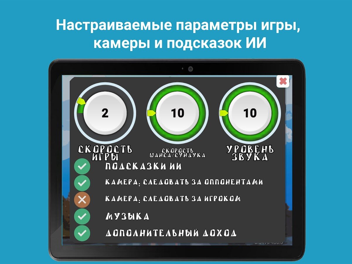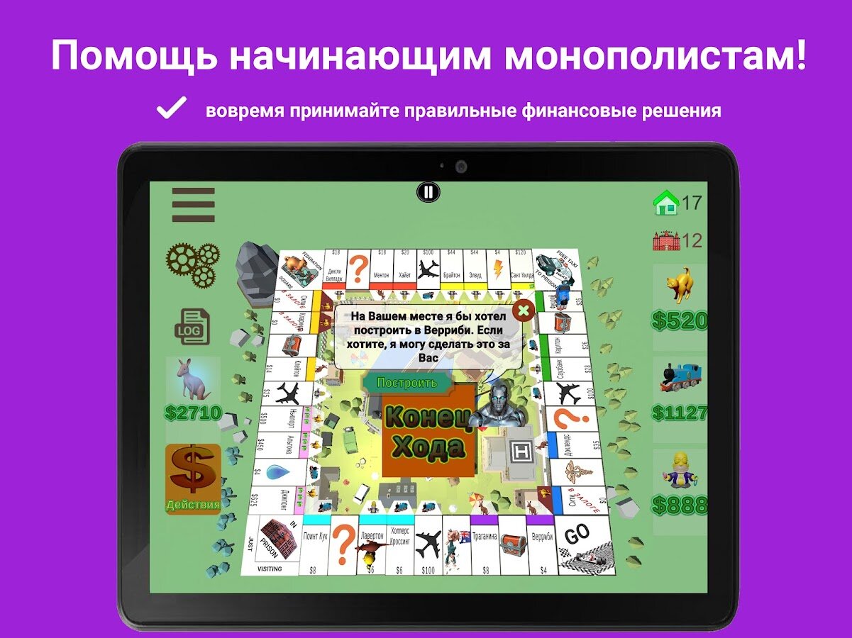 Воспользуйтесь уникальной системой игровых подсказок от ИИ, чтобы научиться применять сотни тактик, правильно оценивать торговые предложения, находить выгодные сделки в любой моменты игры, а также грамотно управлять капиталом — оставляя наличными минимальное необходимое количество, вкладывая остальное в торговлю и улучшения недвижимости. Совершенствуйтесь, просматривая игры лучших игроков из Лидербордов – это один из лучших способов почерпнуть проверенные тактики.