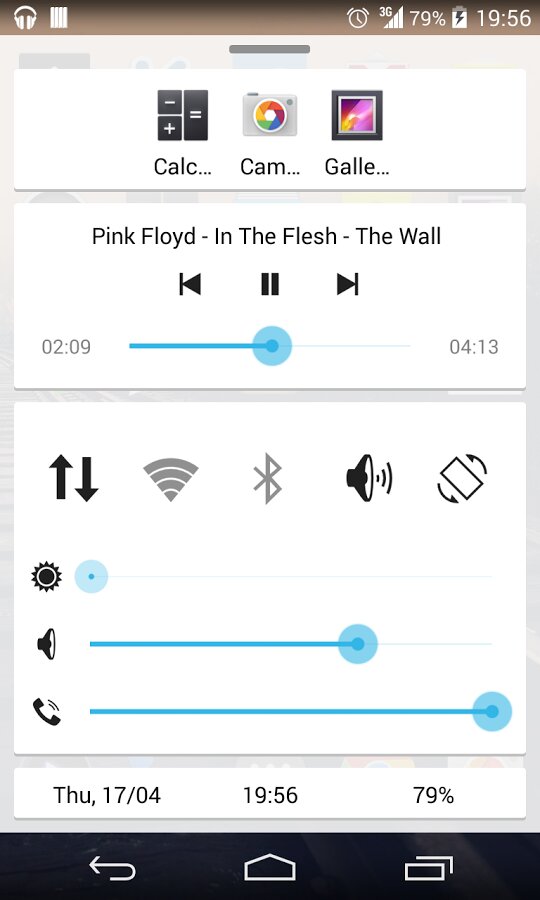 Программа аналог центра уведомлений в айос7. Ничего лишнего, ярлыки приложений, переключатели и полное управление медиа-проигрывателем. В программе присутствует гибкая настройка интерфейса и поддержка сторонних значков приложений.