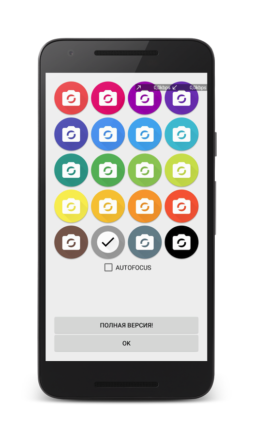 Виджет на рабочий стол, который делает быстрое фото без звука затвора с автофокусом.Затем фото сохраняется в галерею.Вы можете выбрать один из пяти цветов при добавлении. Виджет в стиле Material Design отлично смотрится на рабочем столе.В бесплатной версии только серый цвет.