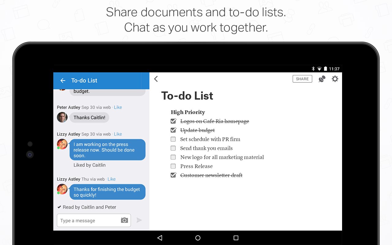 Quip — это современный текстовый редактор, который позволяет профессионально создавать документы на любом устройстве, будь то телефон, планшетный или обычный компьютер. В Quip документы и сообщения объединяются в «темы» обновлений, похожие на чат, что удобно и позволяет плодотворно работать вместе с другими пользователями.