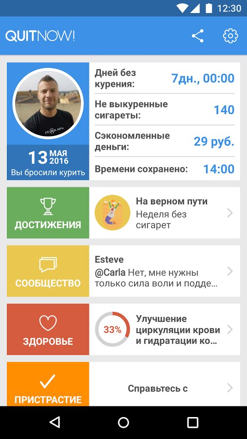 QuitNow! — очень полезная программа для Android, которая поможет бросить курить. После простой и быстрой настройки QuitNow показывает на рабочем столе смартфона виджет, где можно найти следующую информацию: