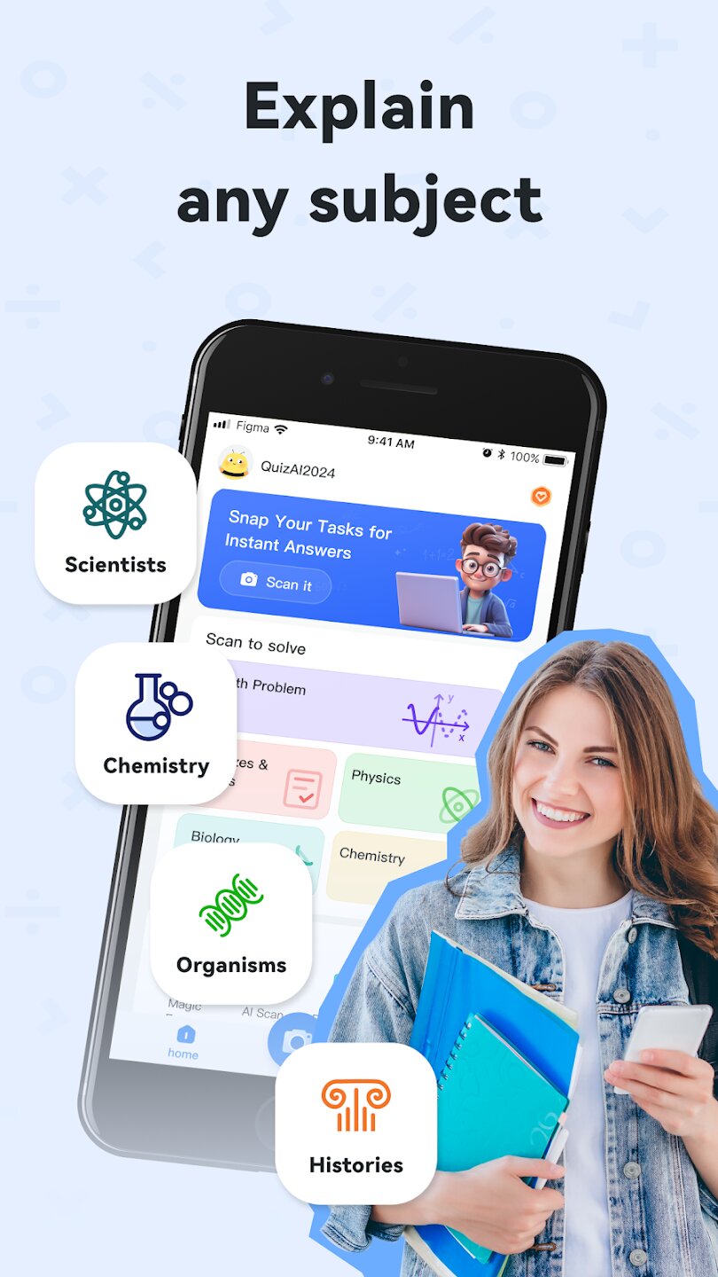 Quiz AI использует передовые технологии искусственного интеллекта для предоставления комплексной академической поддержки. Его основная функция позволяет мгновенно сканировать любую математическую задачу или академический вопрос с помощью камеры вашего устройства. Затем ИИ анализирует содержание и предоставляет точное пошаговое решение, помогая вам не только получить правильный ответ, но и понять основные концепции и методологии для эффективного решения задач.