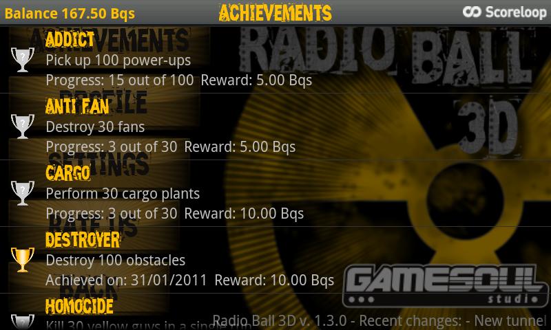 Radio Ball 3D — игра в туннеле с акселерометром. Урановый шар, движимый радиоактивными выбросами, мчится по туннелю. Сможете ли вы добраться до конца? Пройдите как можно дальше, собирайте бонусы, делайте комбо, избегайте или уничтожайте препятствия. Набери как можно больше очков и продолжай катиться. Играйте и соревнуйтесь с другими игроками через Scoreloop.