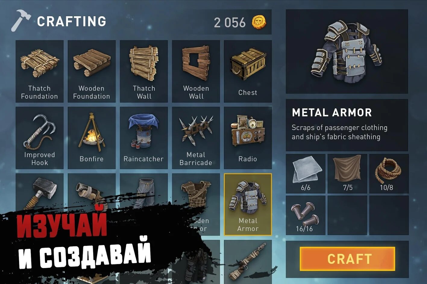 Лови рыбу, готовь еду и собирай питьевую воду. Создавай строительные материалы, одежду, оружие, сундуки и другие необходимые для выживания предметы!