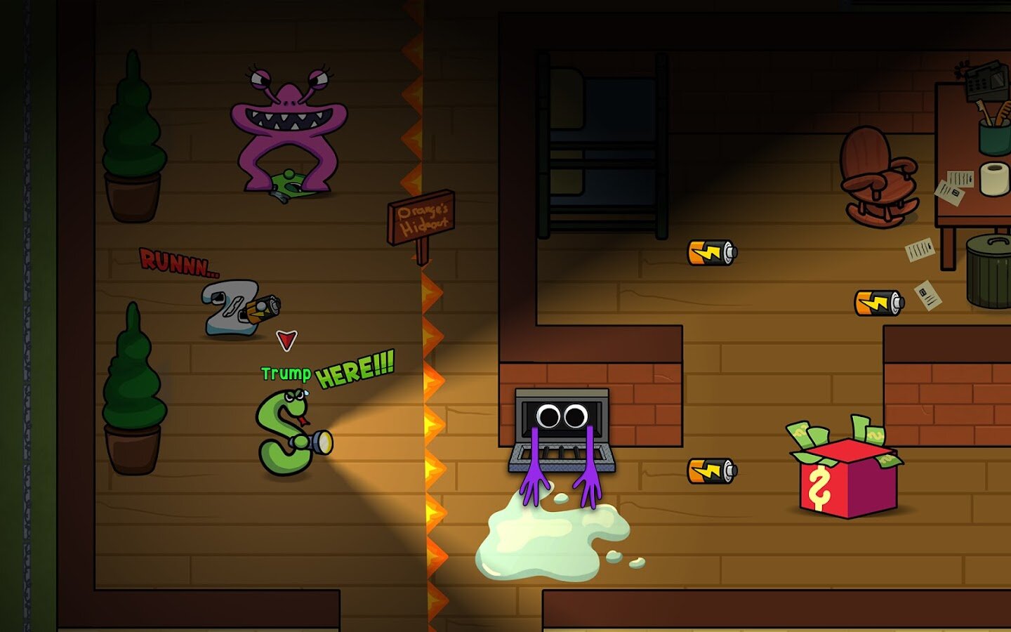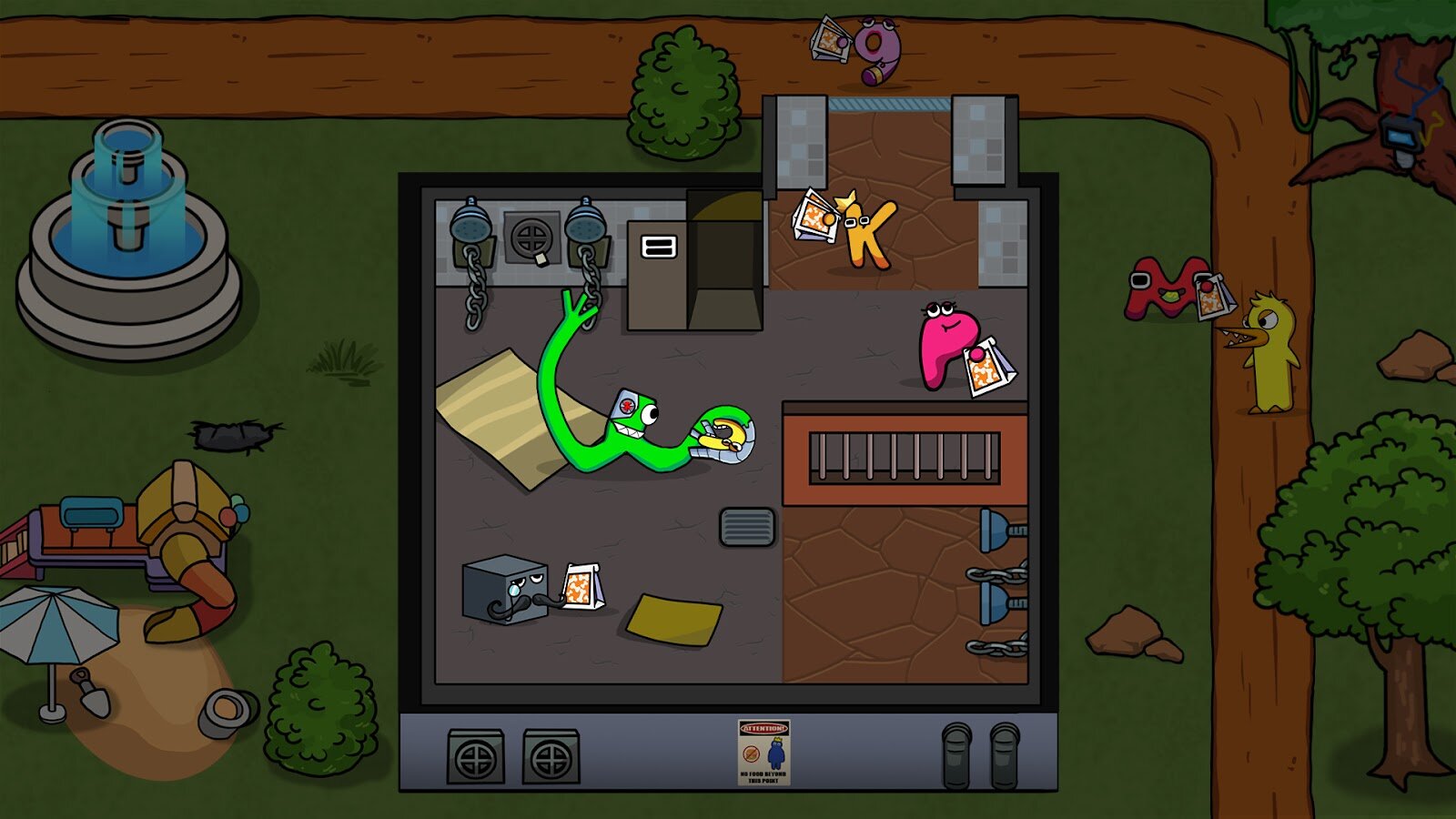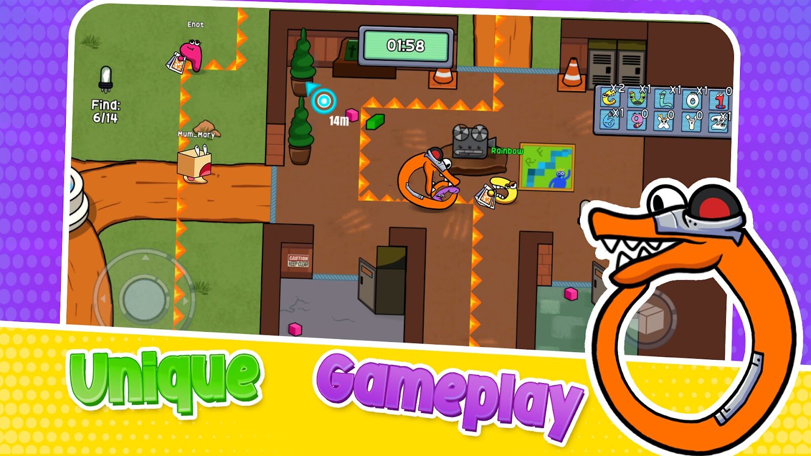 - ❤️ O: Оранжевый радужный монстр. Вам нужно постоянно кормить Оранжевого монстра, чтобы они не выходили играть. К счастью, появляется оранжевая линия, показывающая, где будут ходить оранжевые монстры во время патрулирования, поэтому вы можете быстро спрятаться, если увидите, что они скоро появятся.