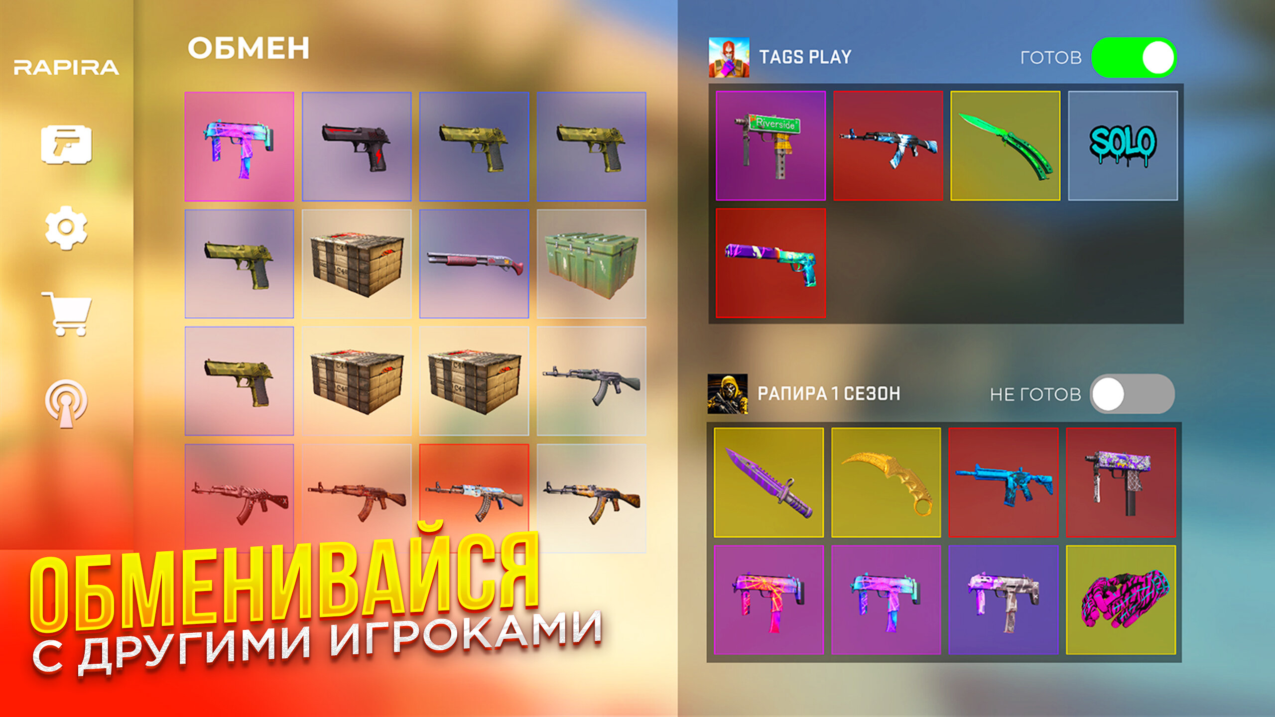 - Открытый рынок, управляемый игроками, для торговли скинами и предметами.