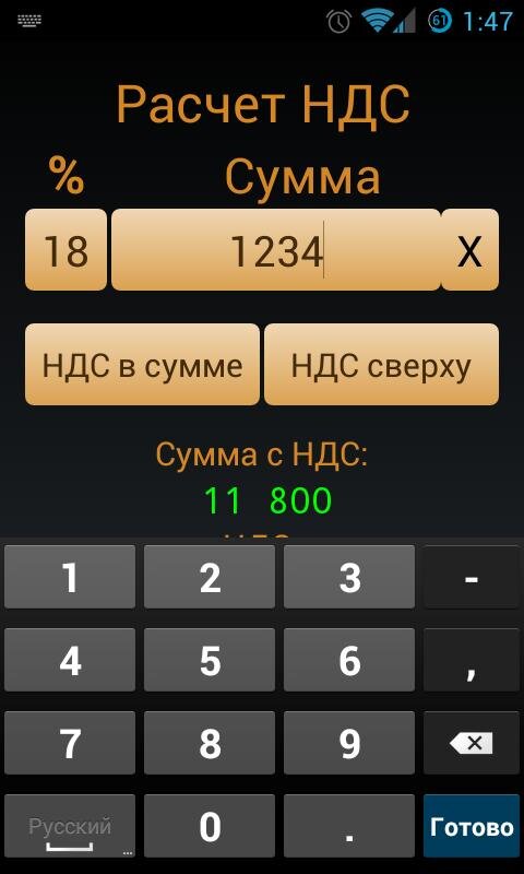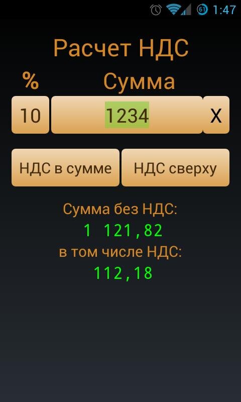 Приложение помогает найти НДС от суммы. Легкая и простая в управлении.