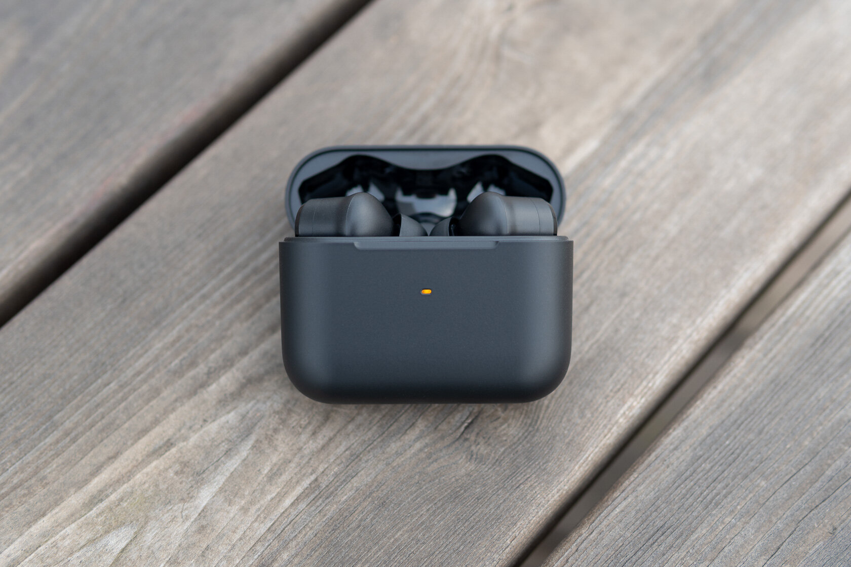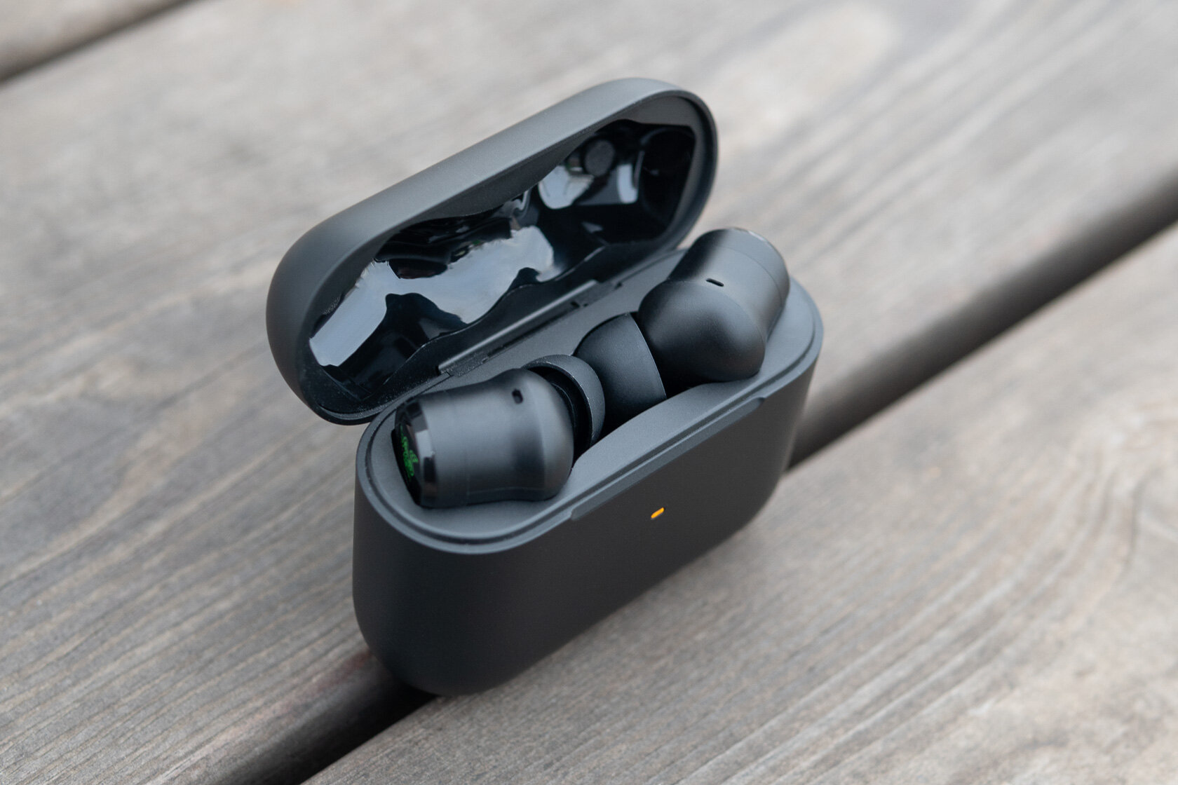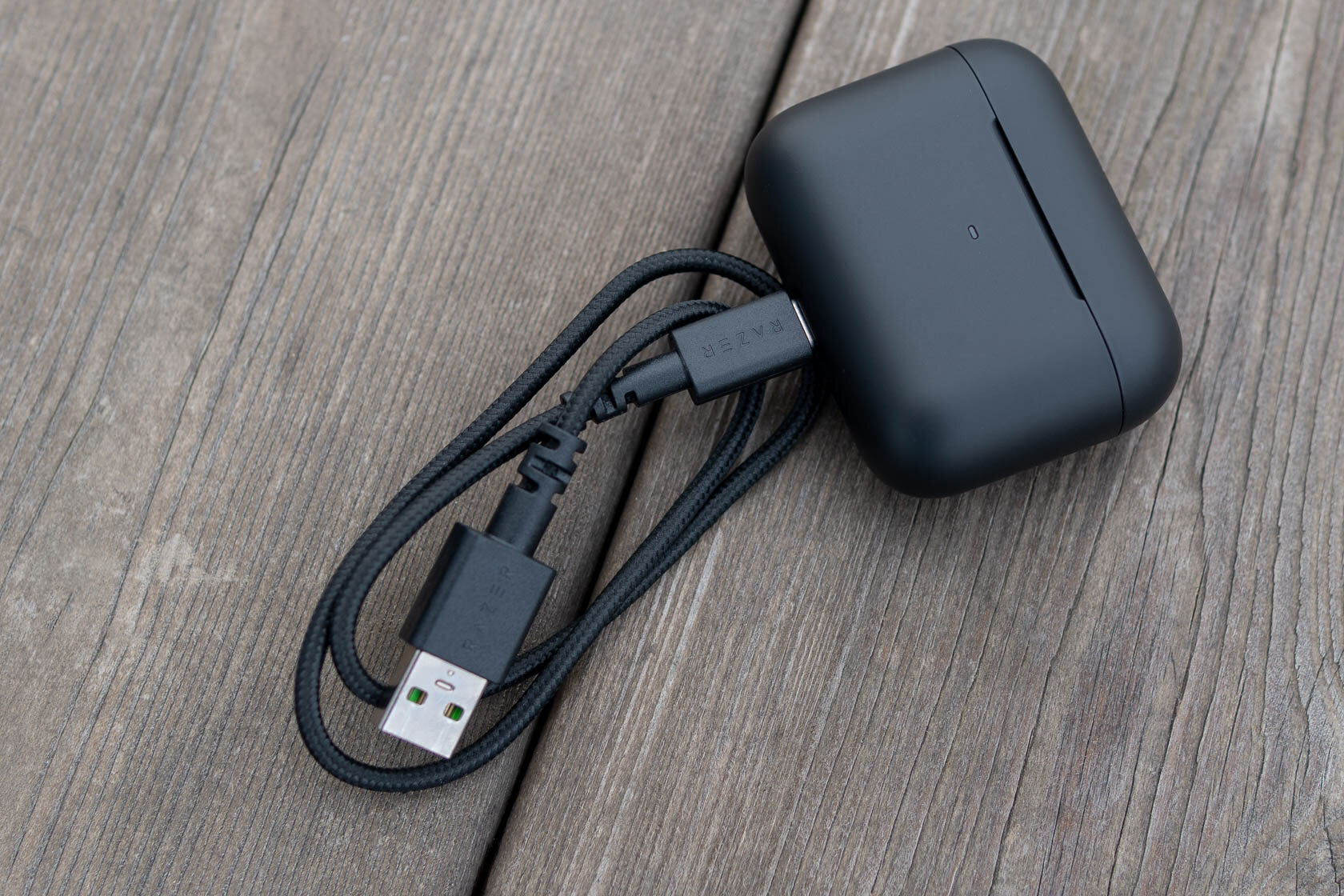 Уровень аккумулятора кейса не отображается в приложении, ориентироваться можно только по трехцветному индикатору. Зарядка через USB-С с нижней стороны кейса. В комплекте идёт короткий кабель в тканевой оплётке — ещё одна геймерская деталь.