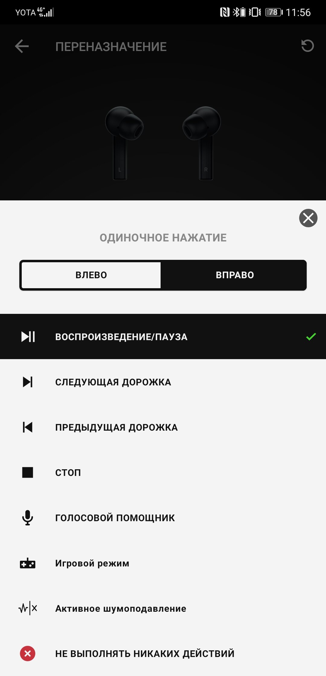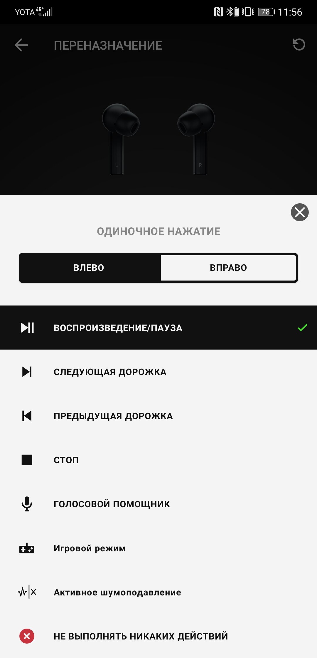 Глянцевые логотипы на затычках — не просто украшение, но ещё и сенсорные панели для управления. Несмотря на наличие датчиков, однократное нажатие требует секундной задержки пальца, и это совершенно не удобно. Двукратное, трехкратное и прочие действия выполняются без проблем. Всего доступно пять независимых действий, отдельно назначаемых для левого и правого наушников. А очень долгое удержание сенсорной панели безальтернативно активирует режим сопряжения. В списке возможных вариантов не хватает только регулировки громкости. Сенсорная панель извлечённого наушника блокируется.