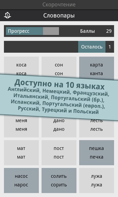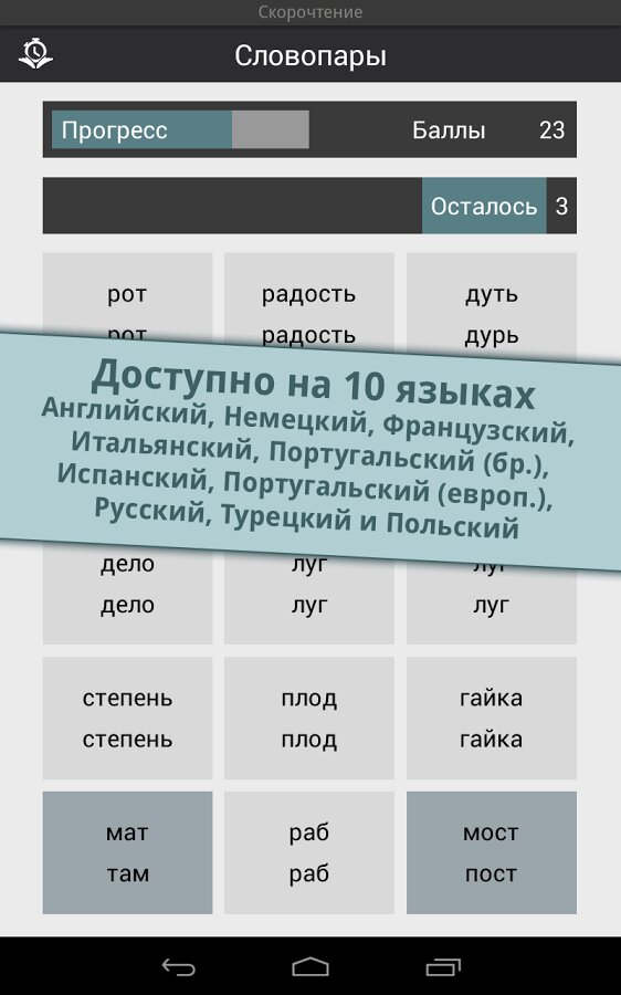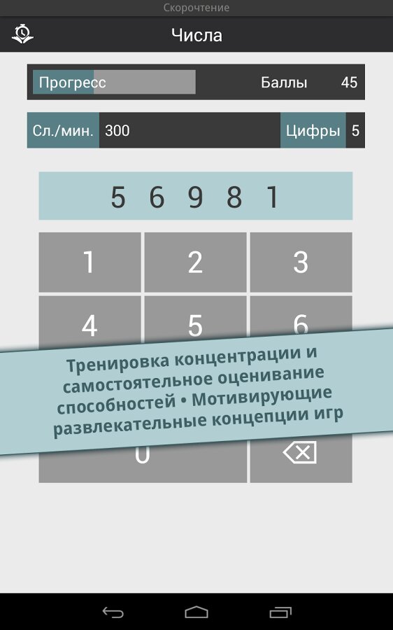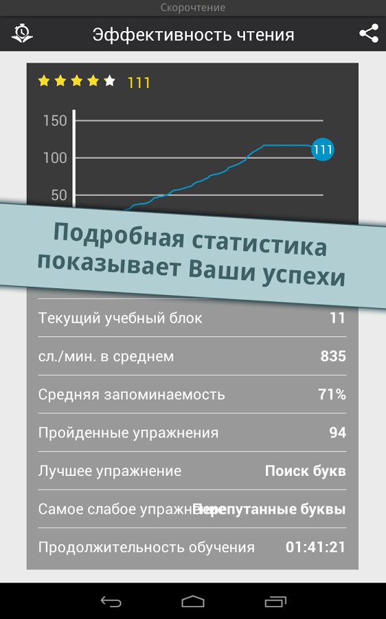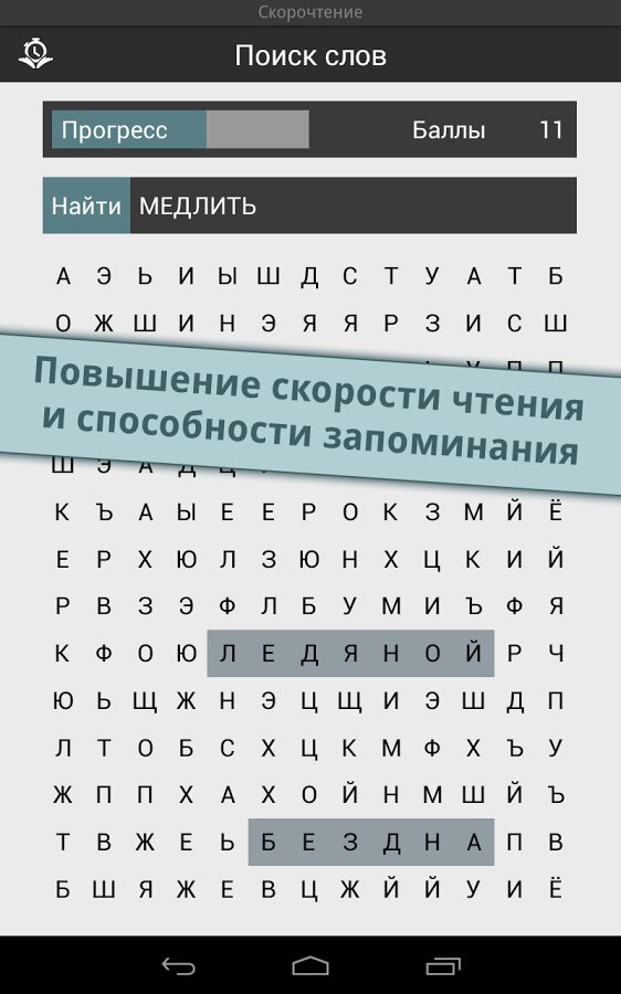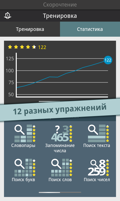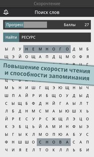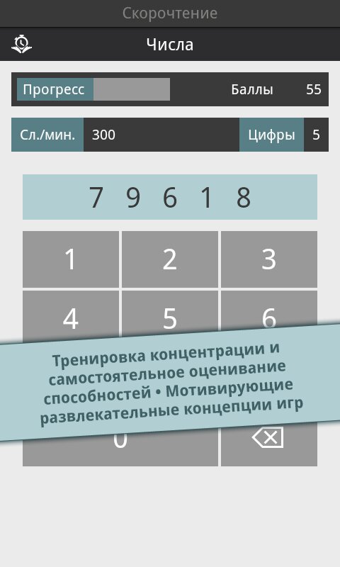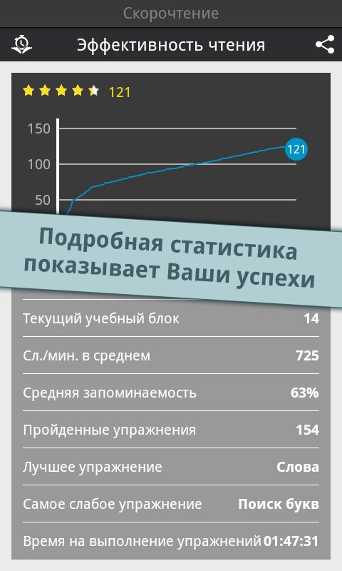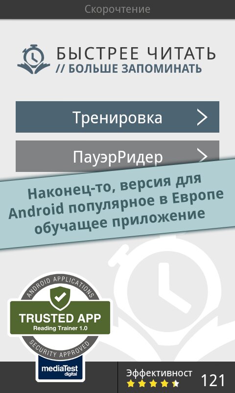 Reading Trainer — поможет вам улучшиь ваше скорочтение 12 интерактивными упражнениями в игровой форме. Скорость чтения участников тестирования повышалась в среднем на 143% за 10 дней. Полное описание: Улучшите Ваше скорочтение при помощи 12 интерактивных упражнений в игровой форме.Это идеальное приложение для увеличения скорости чтения в два раза, а также улучшения запоминания. Долгожданное топ-приложение в категории образование теперь и для Android!- существенное увеличение скорости чтения- тренировка глаз и умственных способностейНо это ещё не все. В игровой форме Вы освоите все необходимые способы эффективного чтения и существенно разовьете своё скорочтение; это подразумевает:- быстрое распознавание чисел, букв и слов- свободные движения глаз- повышение способности концентрироваться- расширение диапазона зренияРезультат каждого упражнения оценивается в форме графика. Чем больше Вы получаете звезд, тем ближе становитесь к желаемой цели — эффективной технике чтения и при этом, с максимально высокой скоростью.Выполняя тесты на чтение разнообразных текстов, Вы в любое время можете проверить свою скорость чтения. Отвечая на вопросы к этим текстам на втором этапе, Вы проверяете свою запоминаемость. Это идеальное сочетание для достижения эффективной техники чтения и улучшения запоминаемости.