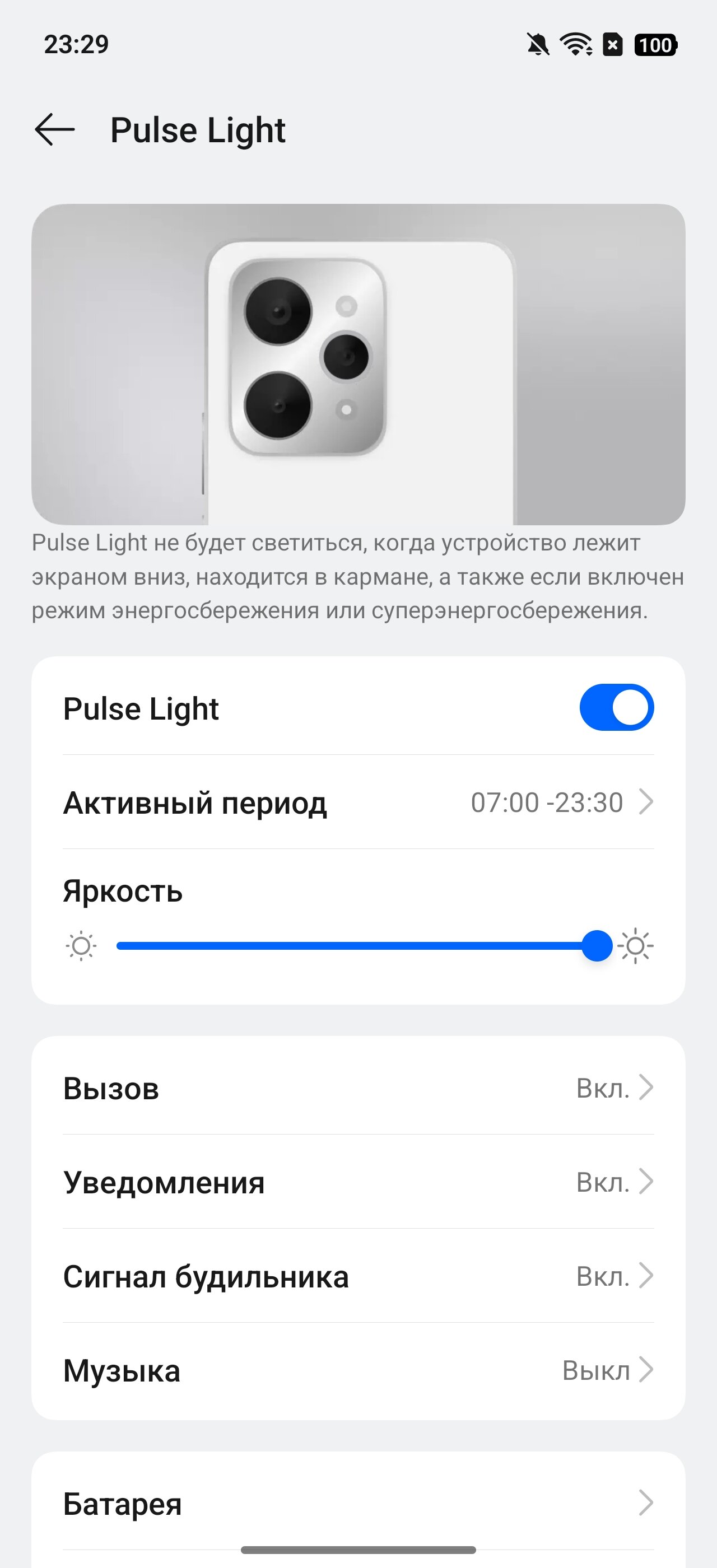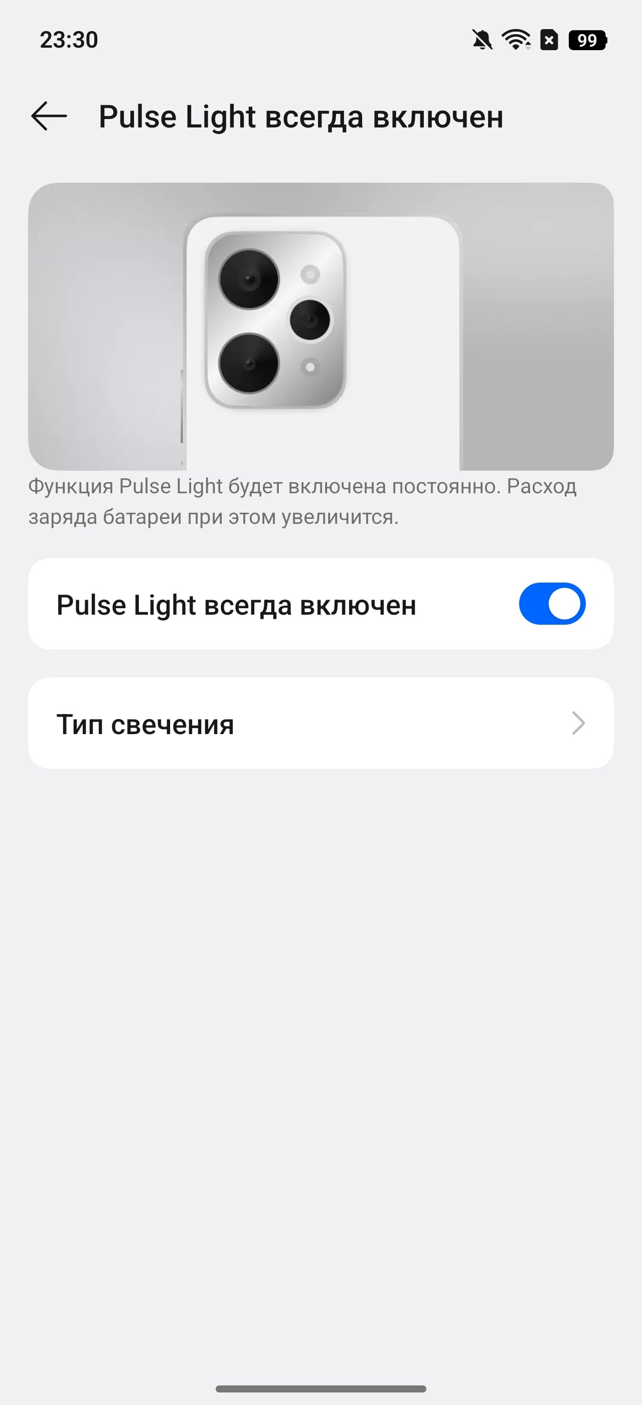 Стоит сказать, что у островка камер есть ещё одна интересная фишка — объектив, расположенный справа, получил окантовку с RGB-подсветкой (технология называется Pulse Light), которая выступает в роли индикатора, оповещающего о различных событиях. Например, окантовка пульсирует во время входящих звонков, уведомлений или оповещений будильника, плюс можно активировать синхронизацию подсветки с рингтоном.