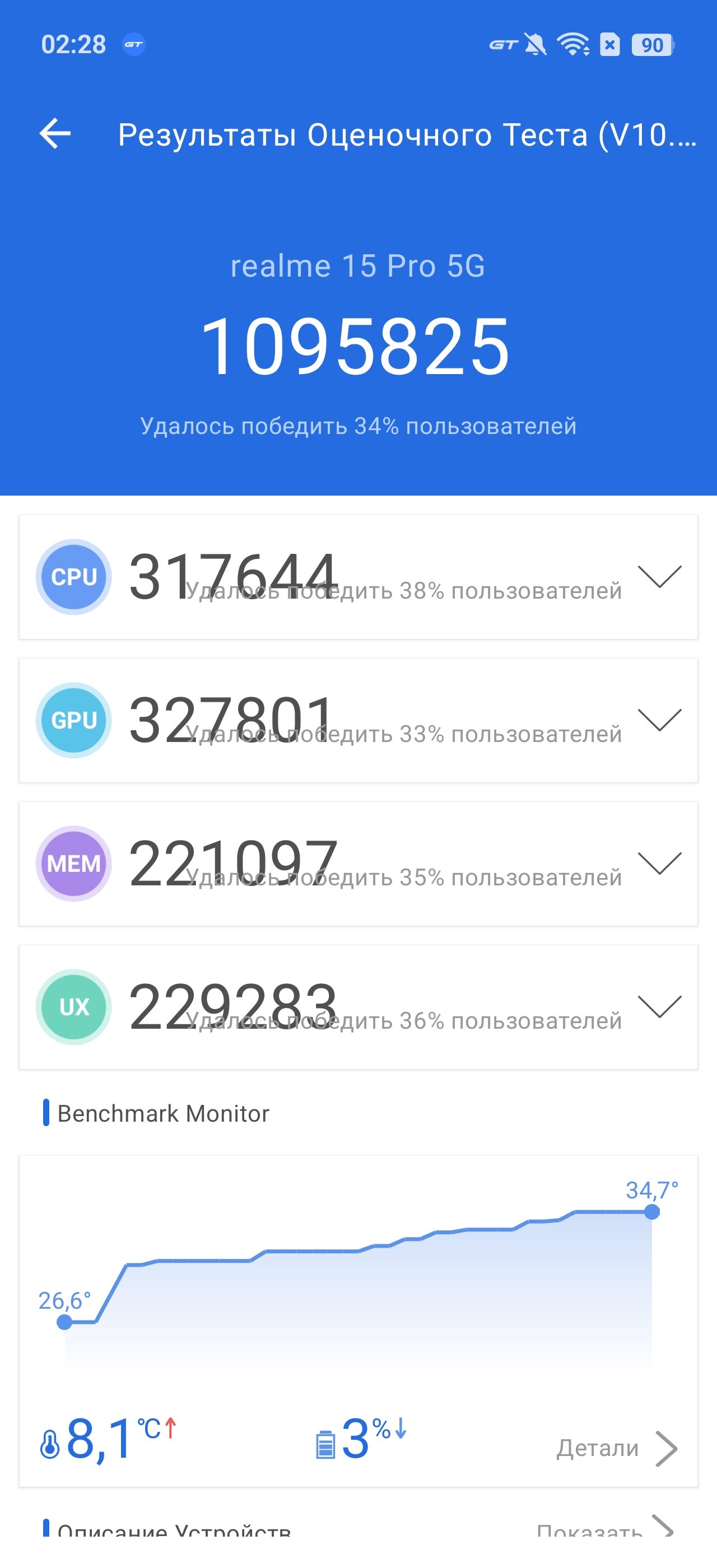 За производительность realme 15 Pro отвечает предтоповый процессор Snapdragon 7 Gen 4 от компании Qualcomm, который в паре с 12 ГБ оперативной памяти демонстрирует приличные результаты в синтетических тестах — одни из лучших среди представителей среднего ценового диапазона. Кроме того, что вполне ожидаемо с таким «железом», операционная система и пользовательский интерфейс работают предельно отзывчиво, анимации выглядят плавными, софт запускается шустро.