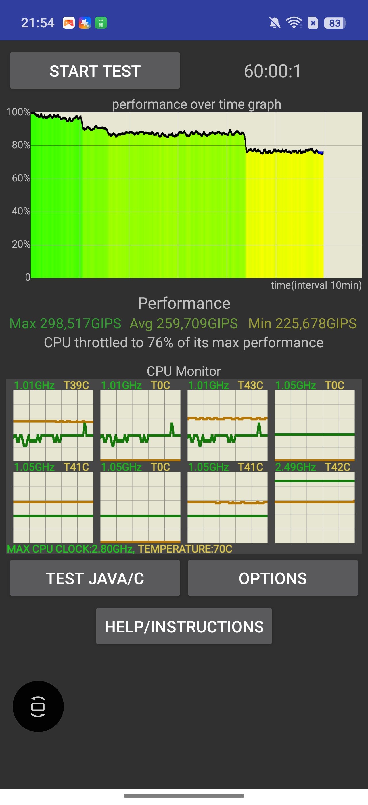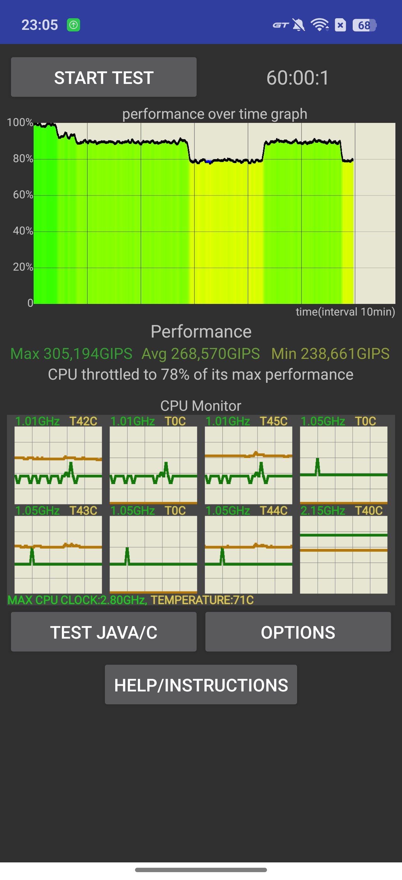 И, что самое интересное, модель отлично справляется с распределением тепловой энергии системы на кристалле при длительных высоких нагрузках. Конечно, чип вынужден сбросить тактовую частоту ядер, дабы избежать перегрева, но в итоге процессор выдаёт в среднем 70% от своей первоначальной производительности — при этом график выглядит очень ровным, без резких скачков и перепадов. Это хорошая новость, так как троттлинг практически не скажется на пользовательском опыте.