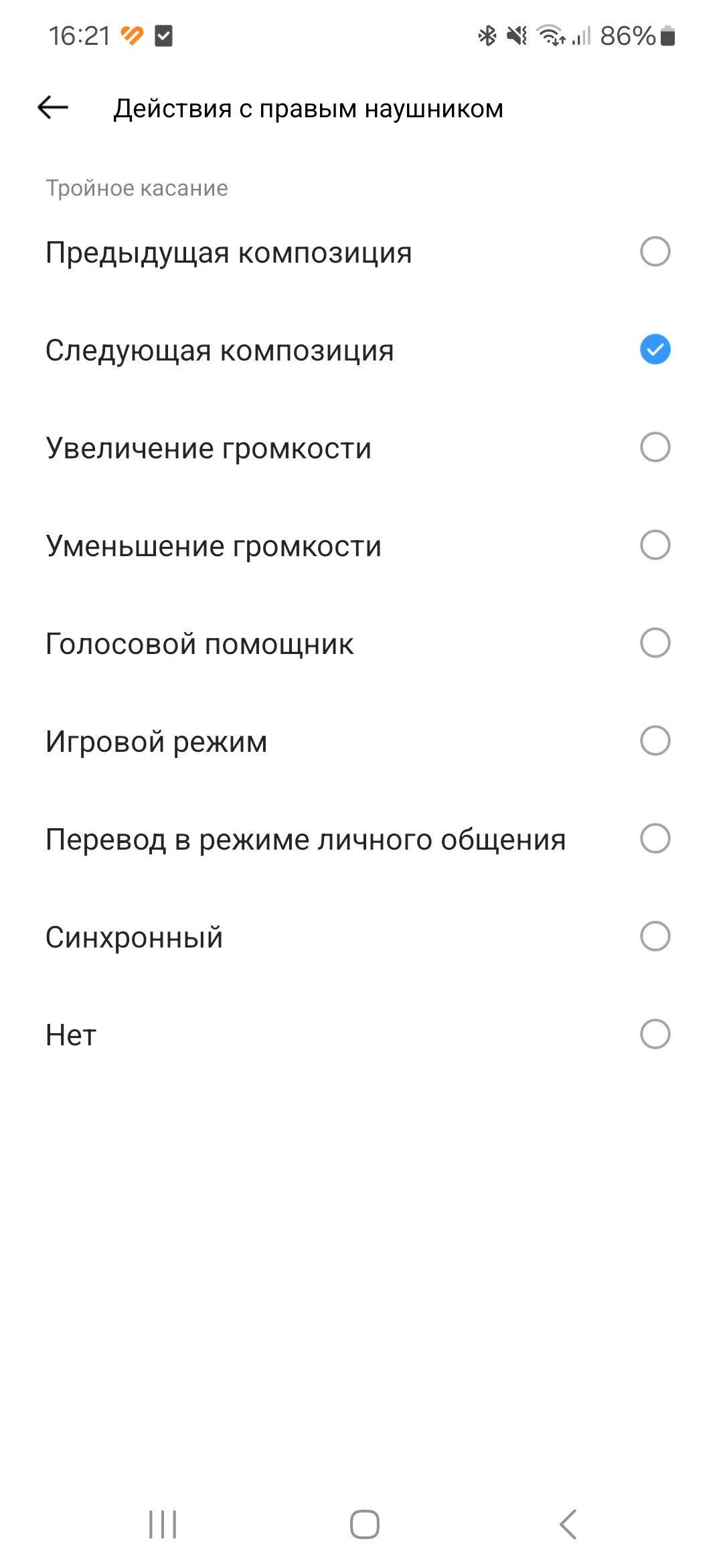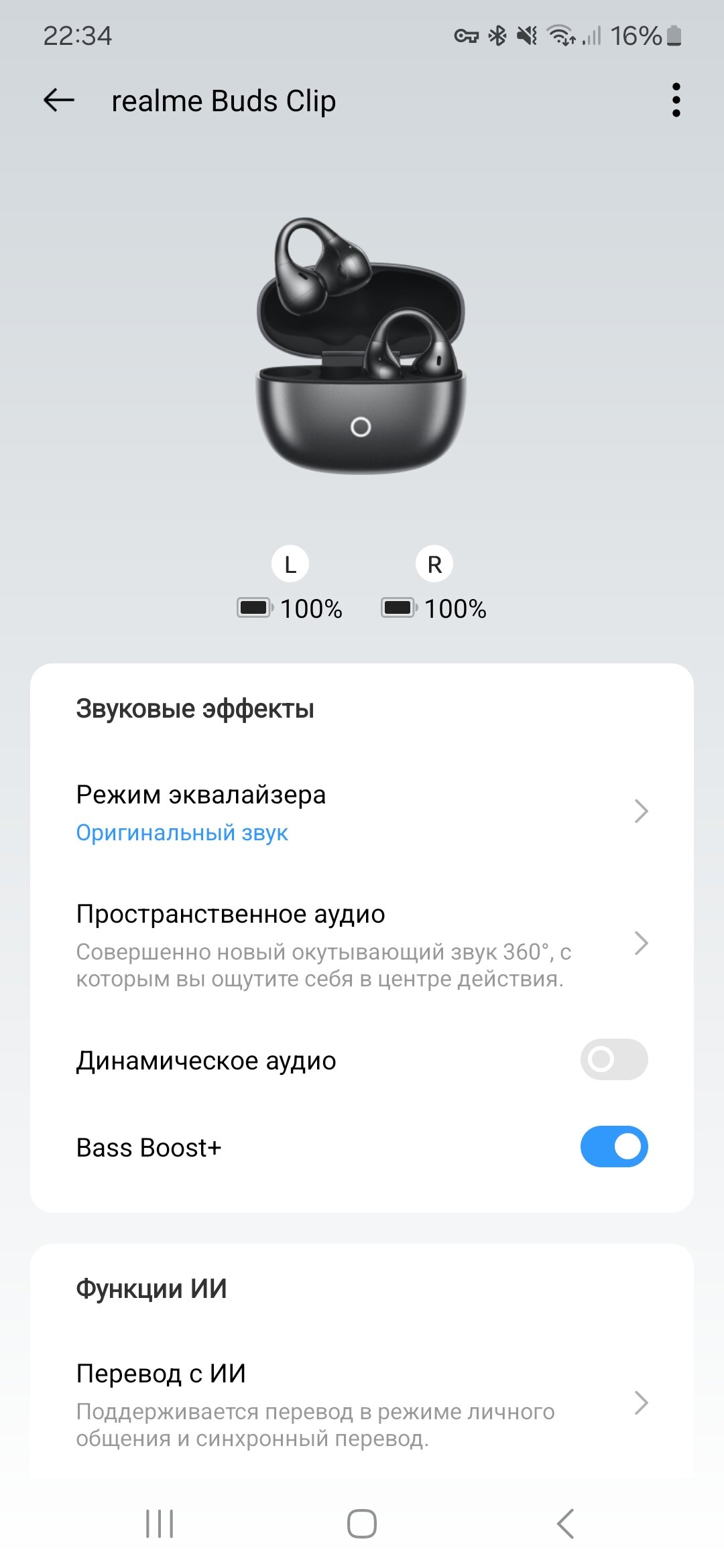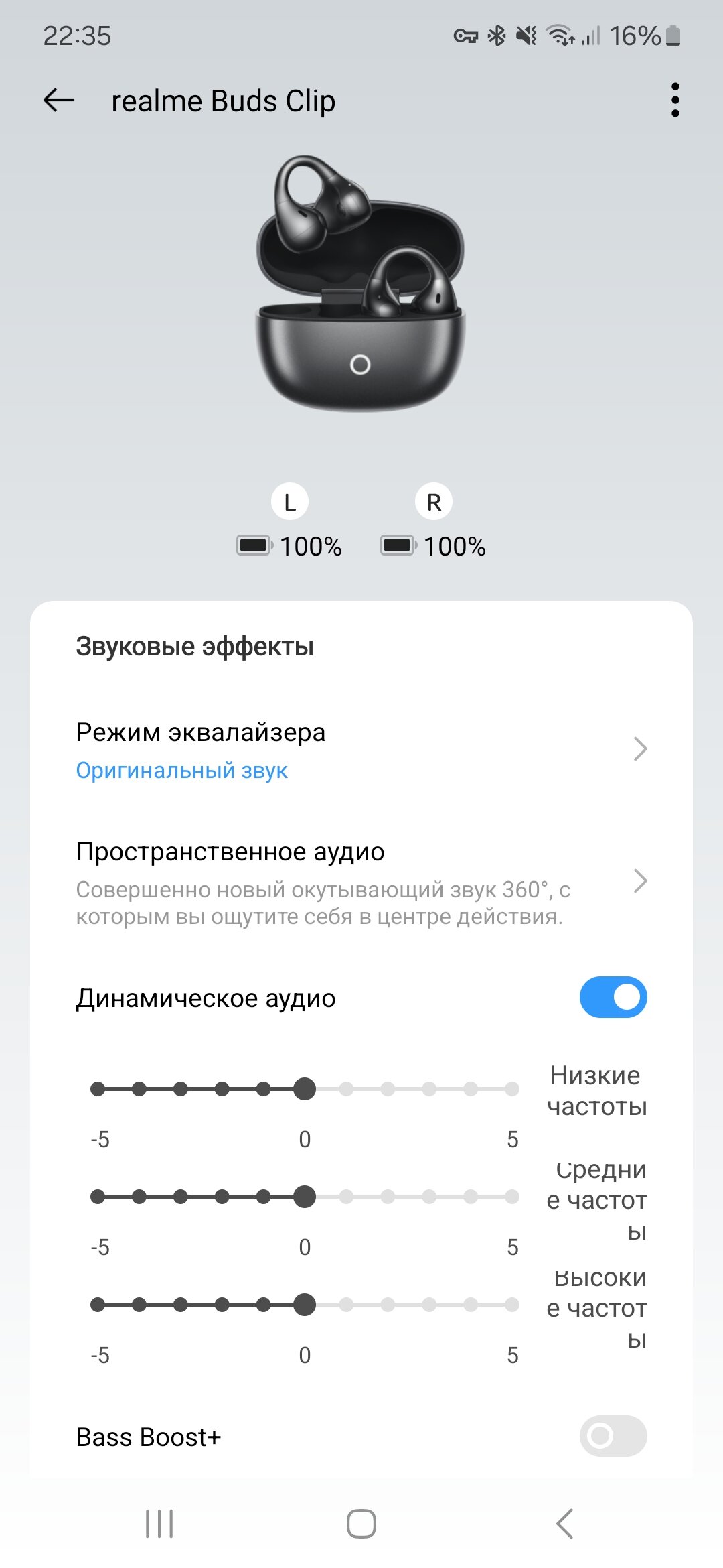 Но меня смущает гиперконцентрация на низких частотах. Включить басы можно аж в трёх местах: два пресета в эквалайзере, ползунок и выделенный режим BassBoost+. Хотя какого-то особого результата от realme Buds Clip не добиться, бас в наличии, но без мощи и объёма. На поверку самая приятная слуху комбинация настроек — это стандартный эквалайзер и выключенный тумблер BassBoost+.