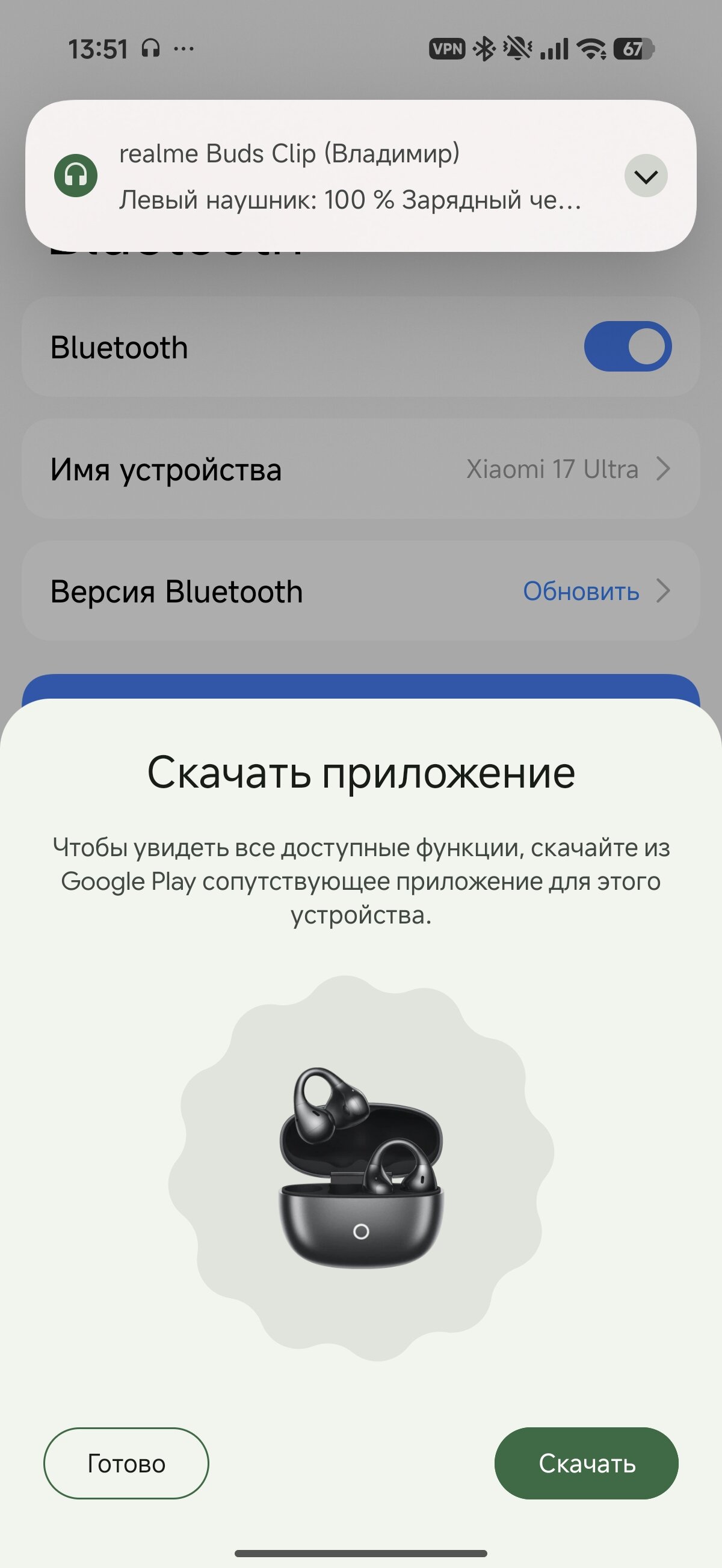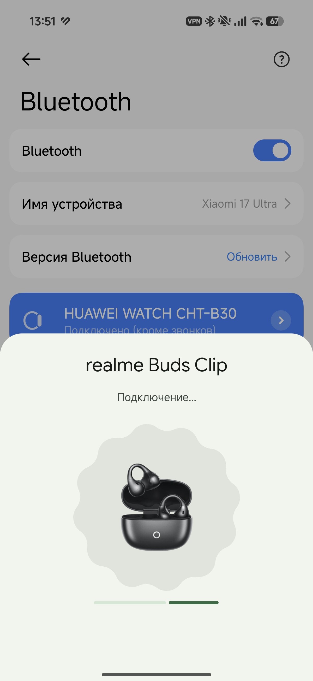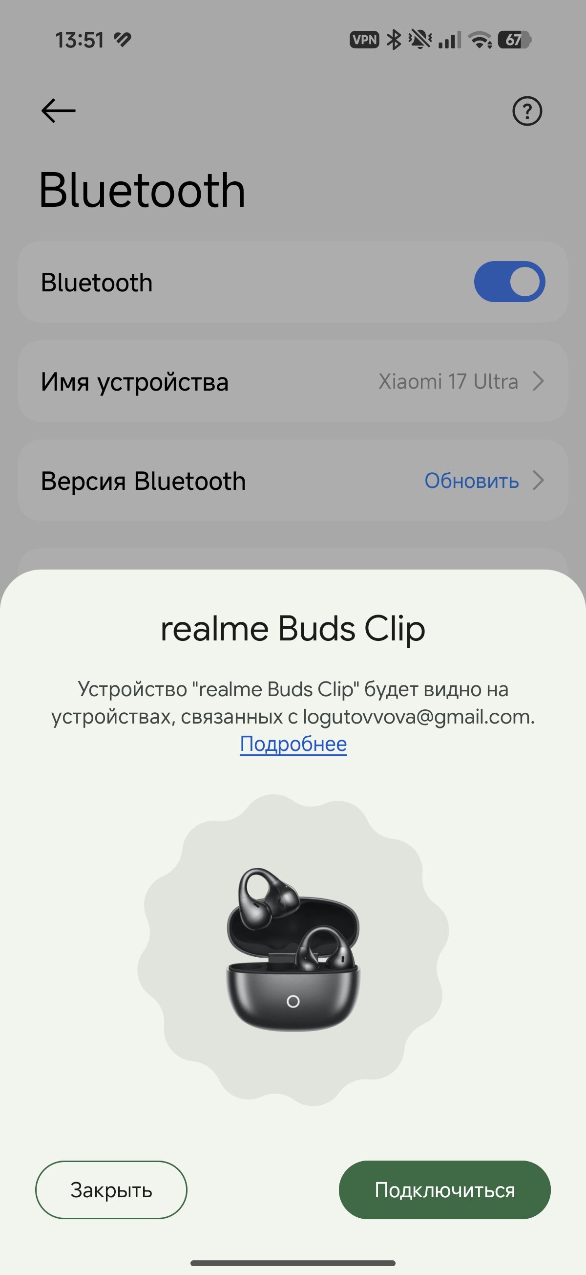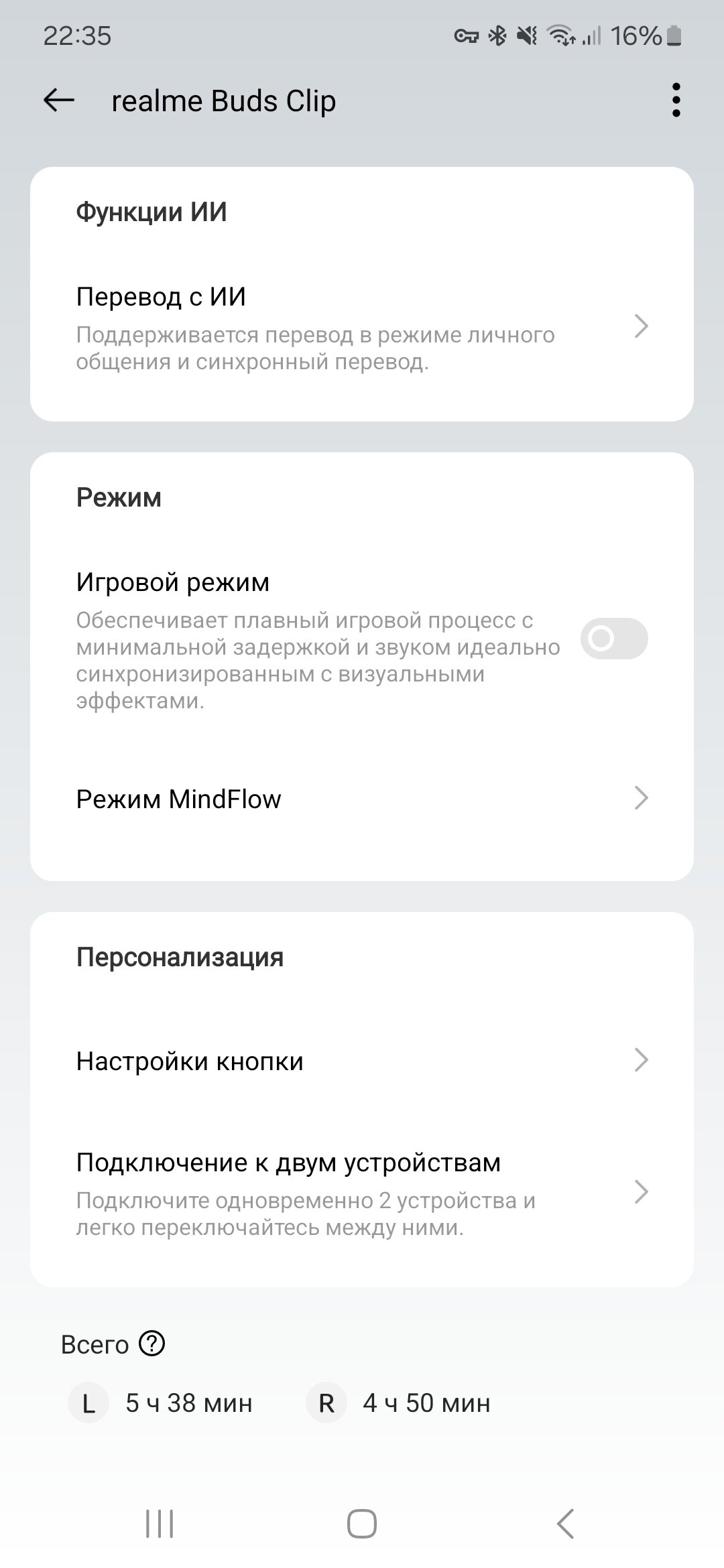 Соединение через Bluetooth 5.4 с кодеком AAC. Наушники поддерживают быстрое сопряжение через Google Fast Pair и могут быстро переключаться между двумя устройствами. Со связью всё прекрасно, realme Buds Clip позволяют ходить по квартире, оставляя смартфон в одной комнате. Контроль настроек осуществляется через фирменное приложение realme Link.