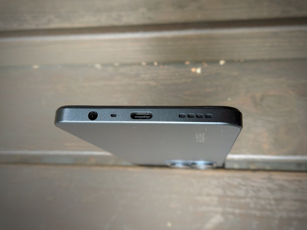 Говоря о внешних данных устройства, нельзя обойти стороной его рекордно малую толщину — она составляет всего 7,49 мм, что делает realme C53 самым тонким смартфоном компании. Также устройство является самым тонким среди всех конкурентов в своём сегменте. Наряду с современным дизайном блока основной камеры, плоские грани отлично дополняют заднюю крышку в матовом исполнении. По заверениям realme, текстура крышки C53 достигается путём нанесения на неё «шести слоёв нанопокрытия». Все кнопки расположены на правой грани устройства, слева — только лоток, о котором замолвим словечко ниже. Снизу разъём USB Type-C, микрофон, динамик и старый добрый миниджек.