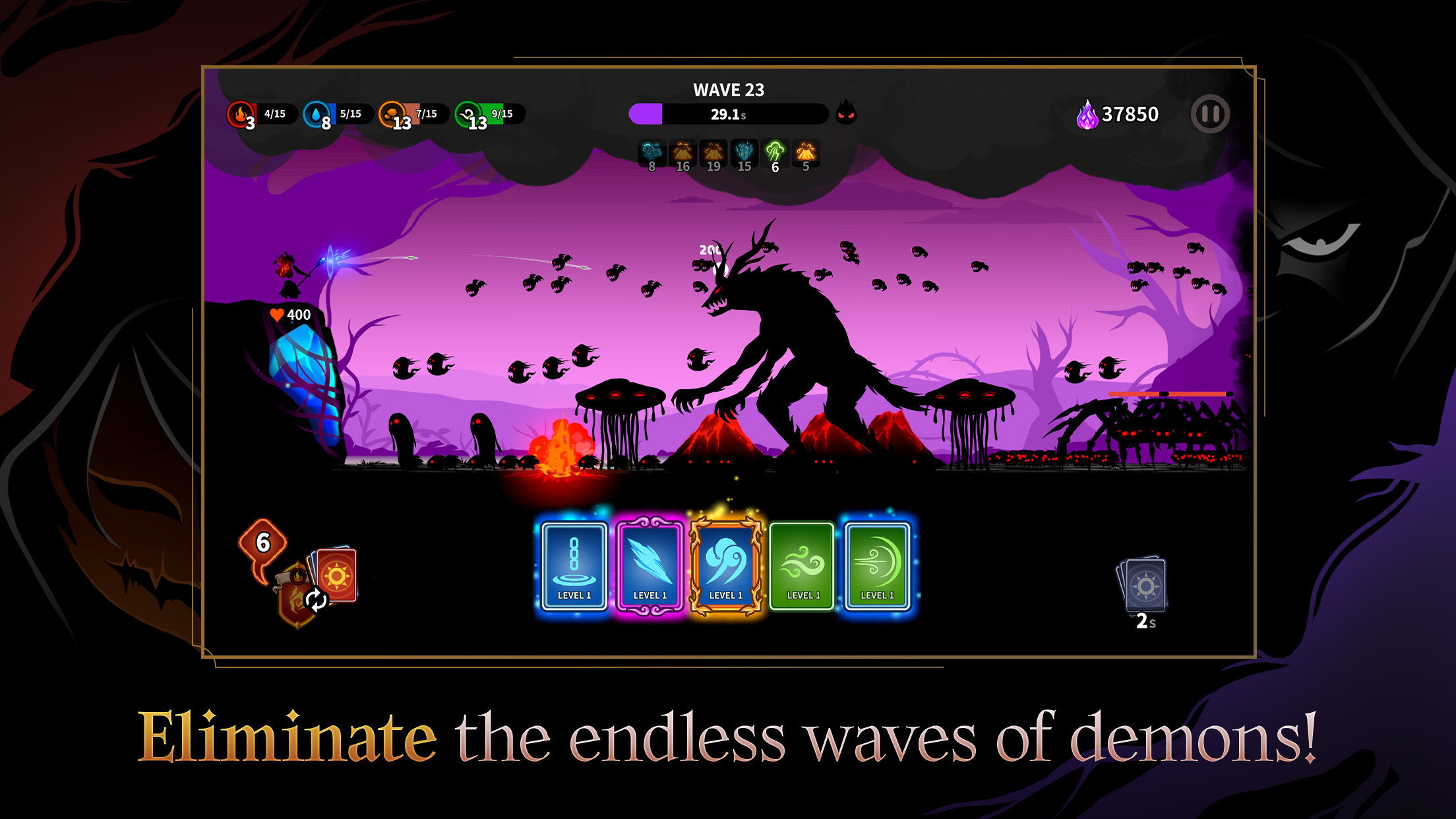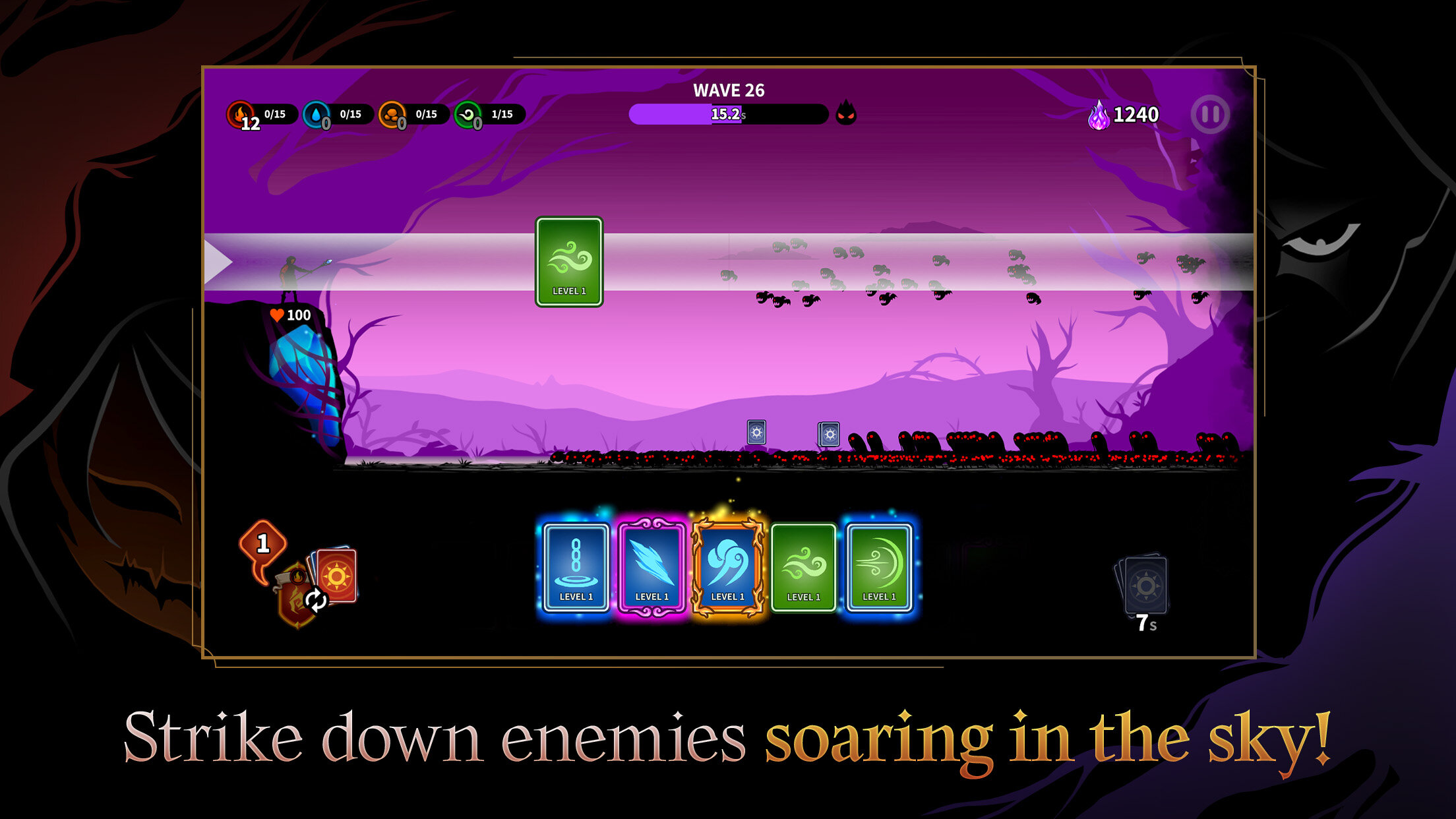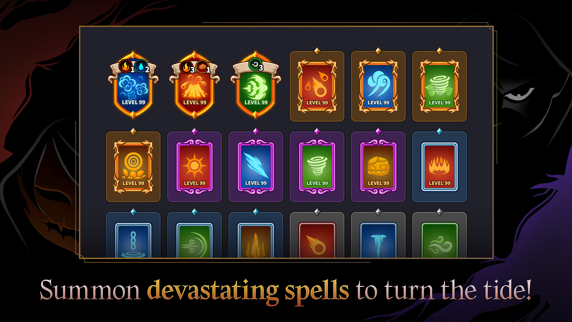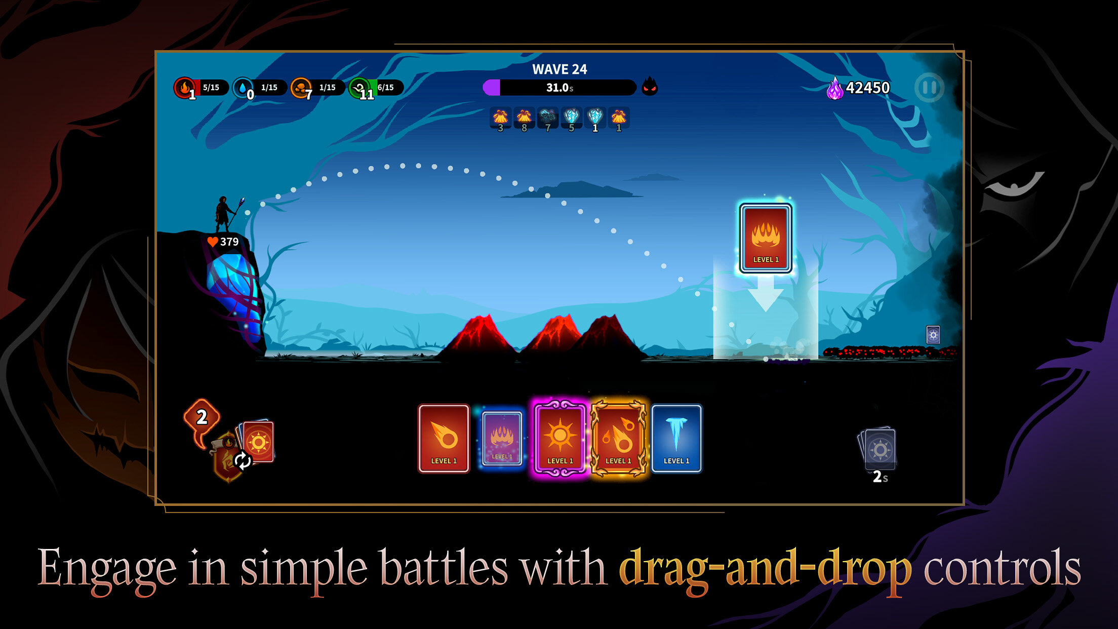 Сражайся с полчищами чудовищ в динамичных волновых баталиях, где важна каждая разыгранная карта. Комбинируй карты, создавая мощные заклинания, и собирай стихийные комбо для уничтожения особо сильных противников. Постепенно открывай новые тактики и уникальные способности, которые помогут выжить в этом суровом мире, полном опасностей и мрачных тайн.