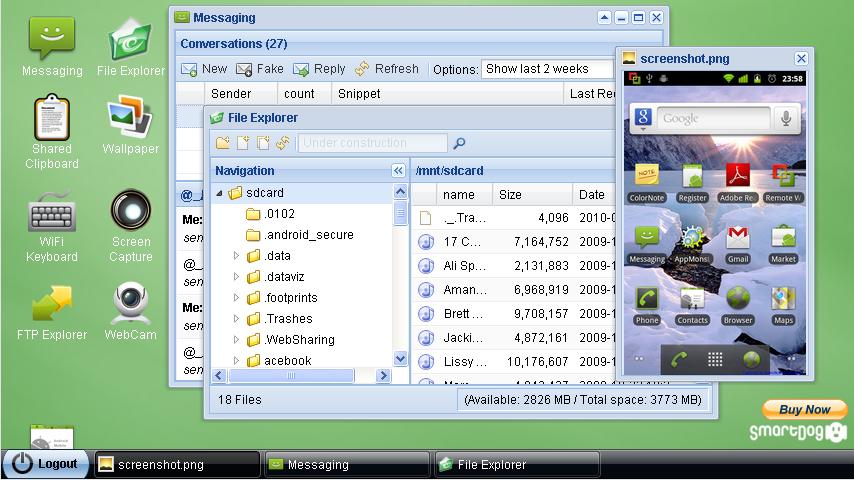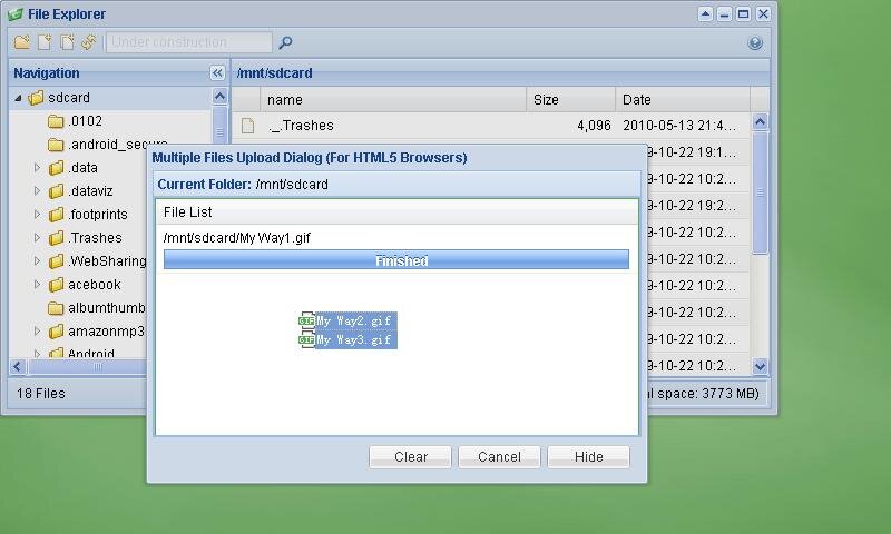 - Файловый проводник: позволяет управлять файлами на SD карте и передавать их между компьютером и смартфоном. Поддерживает множественную загрузку файлов(drag-and-drop)(для браузеров с технологией HTML5), позволяет просматривать изображения и т.д.