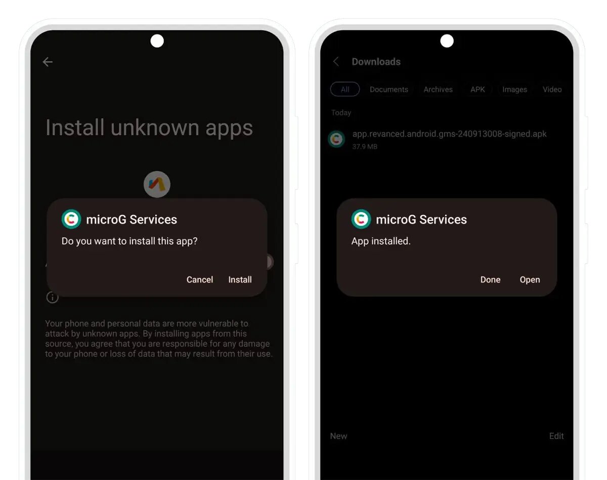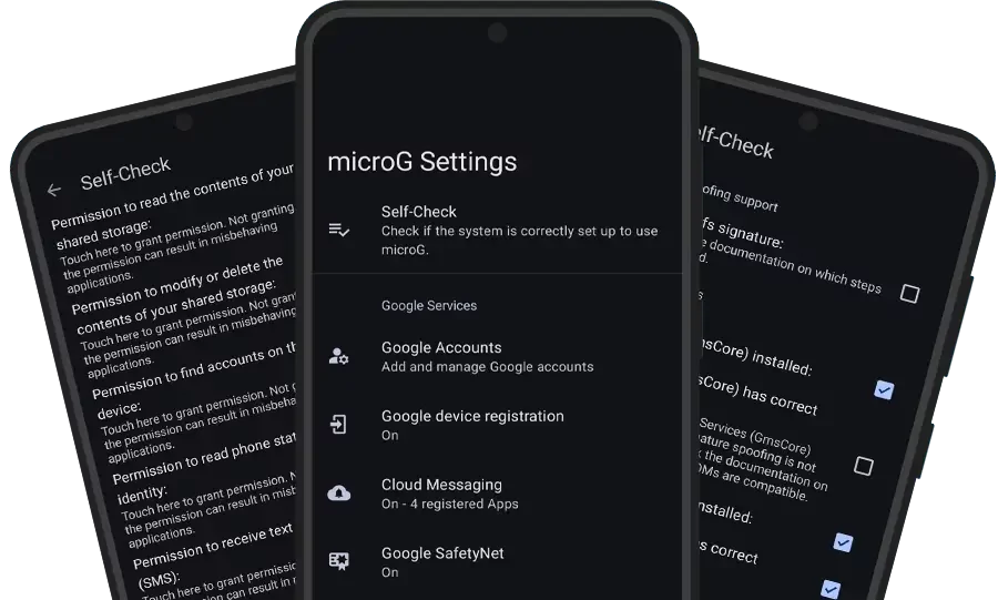 - Работать рядом вместе GMS уже присутствующем в системе, таким как microG GmsCore или Google Play Services.