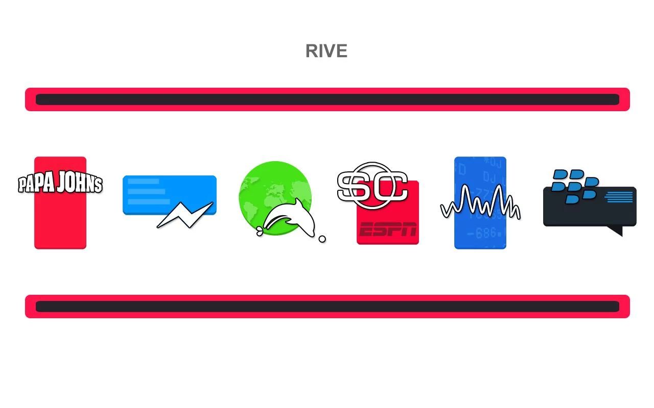 Многослойные иконки Rive имеют необычный стиль: некоторые слегка обрезаны, на другие нагромождены какие-то пиктограммы из самих приложений, а третьи выглядят совсем необычно (прямоугольник с пересекающей надписью). Дизайн определенно самобытный и интересный. В наборе более 1 000 иконок и 12 обоев без необходимости скачивания.