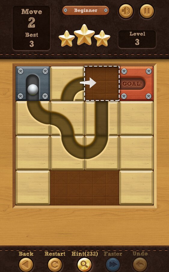 Roll the ball: Slide puzzle — проведите катящийся шарик по лабиринту. Меняйте местами блоки, содержащие отрезки пути, чтобы построить для шарика путь к цели. Развивайте свои логические способности и сообразительность в этой интересной игре для Андроид. Цель игры проста и состоит в том, чтобы привести шарик к отмеченной на игровом поле цели. Игровое поле состоит из прямоугольных блоков. Большинство из них можно передвигать или вращать, но некоторые блоки закреплены неподвижно. Старайтесь сложить путь для шарика за минимальное количество движений.