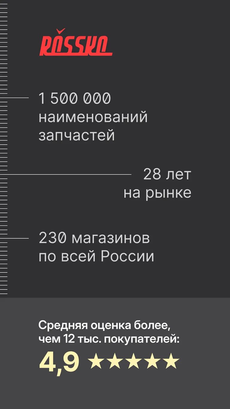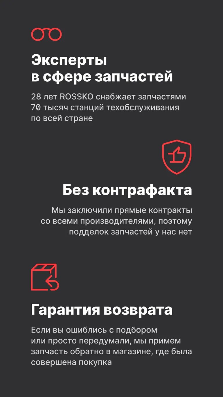 ROSSKO — это официальное мобильное приложение крупнейшей в России розничной сети автозапчастей, которое предоставляет водителям и предприятиям доступ к более чем 1 500 000 запчастей в свыше 230 физических магазинах по всей стране. Компания ROSSKO, работающая на рынке уже 28 лет в качестве надежного дистрибьютора, предлагает как оптовые, так и розничные варианты поставок, опираясь на прямые договоры с производителями. На каждую запчасть предоставляется полная гарантия, охватывающая все — от двигателей до расходных материалов для автомобилей всех марок.